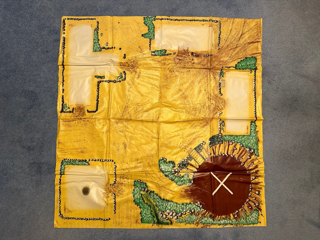 The base of the play set is a vinyl mat that measures four feet by four feet, giving kids a sixteen square foot area for play. The mat is pre-printed with rock borders to go around each of the tents and a spot for the helicopter pad. There are also pre-printed bushes, tire tracks, and the appearance of dirt on the yellow mat. The vinyl is pretty thick, and despite being folded and re-folded multiple times, it has held up fairly well. When I was a kid, my brother and I had play mats similar to this for our Hot Wheels, so seeing a M*A*S*H play set like this brings back many memories form my own childhood.
