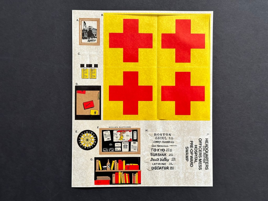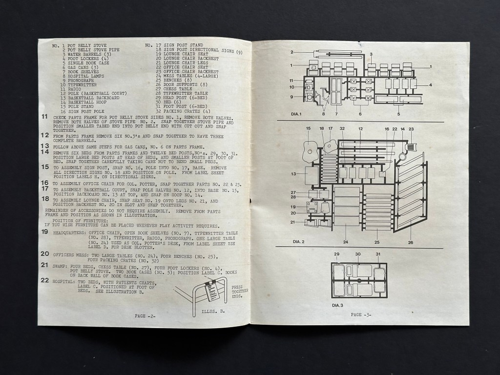 Finally, there are the pieces that came with the set to play with. There are instructions to assist you with building the camp, and the level of detail is where the set really comes together for me. The Mess Tent includes four tables and eight benches. The Headquarters tent includes Col. Potter’s bed, a table, and a shelf. The Swamp includes the four cots, the stove, shelves, footlockers, and even a record player! The main building has cots for wounded, space for Klinger’s desk and cot, and an office for Col. Potter’s desk and a stove. Of course, in the compound there are gas cans, a basketball hoop, and the infamous signpost. The set includes stickers for the bulletin board, Col. Potter’s office, the Swamp, each of the tents, and each of the cities on the signpost. The stickers in this set have never been used, but they definitely show their age. Just like the tent part, the play pieces have never been fully assembled and played with.