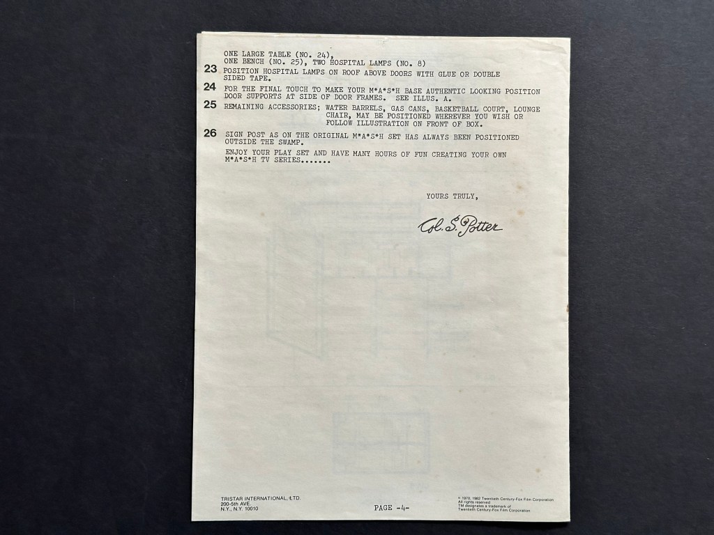 I have wanted one of the M*A*S*H play sets for years because it is a little 4077th that I can have at my home. Although, I doubt I will ever put it together and play with it, it is a really unique toy that was released at the height of the show’s popularity. Tristar created a line of M*A*S*H toys that are still popular with collectors today (there is a full write up on all of Tristar’s toys on mash4077tv.com). Perhaps one day I will invest in completing the Tristar set with the three vehicles and action figures. For now, the M*A*S*H Military Base play set is one of the most fun licensed products I have seen for M*A*S*H, and it is one that I recommend any serious M*A*S*H collector add to their collection. Sets are occasionally available on sites such as eBay, but complete play sets are not cheap. This is a toy for which I wish I could go back in time and buy new to play with and enjoy!
