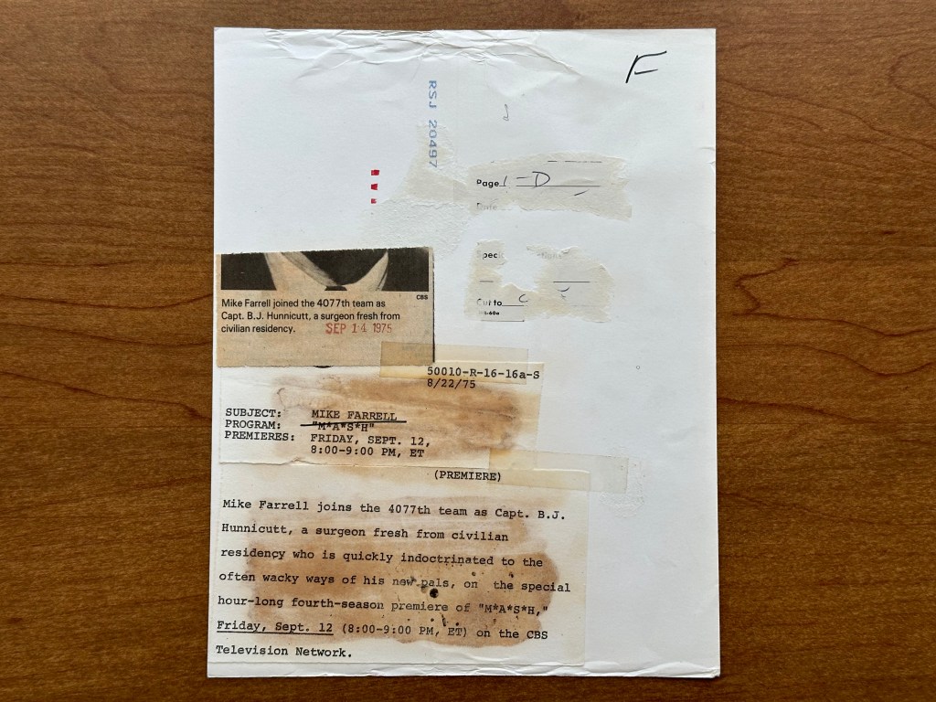 The photo shows Farrell as B.J. wearing his military dress uniform. The red markings on the photo were used by the publication to indicate how the photo would be cropped for publication. While the photo was great for publications to use to promote the premiere episode of season four, it is the information on the back that is more important. A fact sheet would have been sent along with the photo, and many publications glued the fact sheet to the back of the photo. This was practical at the time to ensure that information was not separated from the photo, but it is invaluable to collectors today as we can see the context of the photo. The document, dated August 22, 1975, advertises the premiere episode of season four, which would air on Friday, September 12. In the release, we learn that the first episode of the season, “Welcome to Korea” (04×01), was going to be a special, hour-long episode. The first hour-long episode M*A*S*H produced. The information teases that in that special episode, we will meet B.J., the new surgeon who was “fresh from civilian residency.” We know how quickly B.J. was thrown into life as a combat surgeon in “Welcome to Korea.”