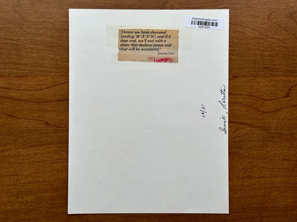 This press photo is an interesting relic of what they now call the “pilot episode” of Cagney & Lacey starring Swit and Daly. After being picked up by CBS, the detective drama ran on CBS for seven seasons, and with Swit as one of its stars, it could have taken her career from the realm of the half-hour sitcom to the hour drama series. As a M*A*S*H fan, I could not imagine “Goodbye, Farewell and Amen” (11×16) without Margaret. And frankly, I can’t imagine the last two seasons of M*A*S*H without the character. Swit would have been hard to replace especially since she was the only main female character in the series. I am sure she was in a very difficult position. Cagney & Lacey offered a new opportunity after M*A*S*H, but ironically, it was M*A*S*H that prevented her from taking the role. She would have been excellent in the series, and Cagney & Lacey had difficulty replacing Swit. The actress cast to replace her was also replaced after six episodes due to stereotypes of female police officers and, I believe, they wanted someone who played Cagney more like Swit had. I am glad we didn’t lose Margaret after season nine of M*A*S*H, but it is hard not to wonder “what if” for Swit’s career after M*A*S*H.