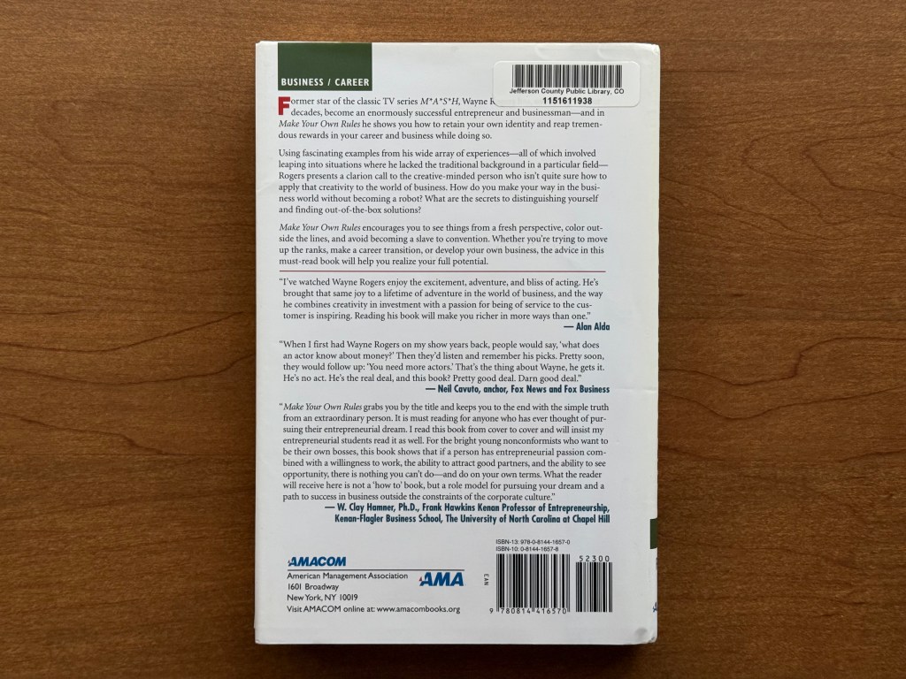 Fans of M*A*S*H anticipating a memoir about Rogers’ acting career and time on the series will find this book disappointing. While M*A*S*H is mentioned in one chapter, it is not even the primary focus of the chapter. His acting career is hardly mentioned despite being heavily publicized on the book’s jacket. That leads to the chief criticism of this book. The book is billed as a business guide with a bit of memoir. And while the book is certainly entertaining and offers some important tips, it is neither a great memoir nor a great business guide. Instead, it is a good business guide with a little bit of biography. Had Rogers focused on one or the other, I feel like it the book would have been more successful. As I read, I found myself wanting either more of a story from his career, or I expected to read more about a business case he presented. Since the book strives to do both, it is not strong at either. That does not mean that this is not a good book. In fact, I found his broader tips for entrepreneurship still relevant today. As a fan of M*A*S*H, and as someone who has worked in the corporate world, I would have liked two books from Rogers: a strict memoir and strict business guide following Rogers’ keys to success. As it is, Make Your Rules: A Renegade Guide to Unconventional Success is a book I would recommend to fans of M*A*S*H as I believe it offers insight into the man behind the actor (and because I am a completionist!).