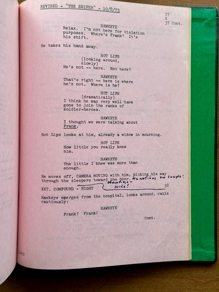 I have reviewed one of Cooper’s scripts before (“Hot Lips and Empty Arms” (02×14)), and all of his scripts from M*A*S*H are bound together in three books. The first volume is the three episodes that he directed in the first season, and the other two volumes are the episodes from season two. I purchased the books from Cooper’s son, and he explained to me that Cooper had all of his scripts leather bound for his personal library. This was a unique way to preserve the scripts from the shows and movies that he had been a part of, either as an actor or a director. It has been widely reported that Cooper and the cast did not get along on set, and that his directing style did not impress the cast. Cooper was critical of the cast in his autobiography where he described his time on M*A*S*H as “one of the greatest disappointments of my life.” Despite the tension on set, the episodes Cooper directed are some fan favorites, and Cooper won an Emmy for the episode “Carry On, Hawkeye” (02×11). Despite the tensions on set, Cooper and the cast produced some great episodes together.