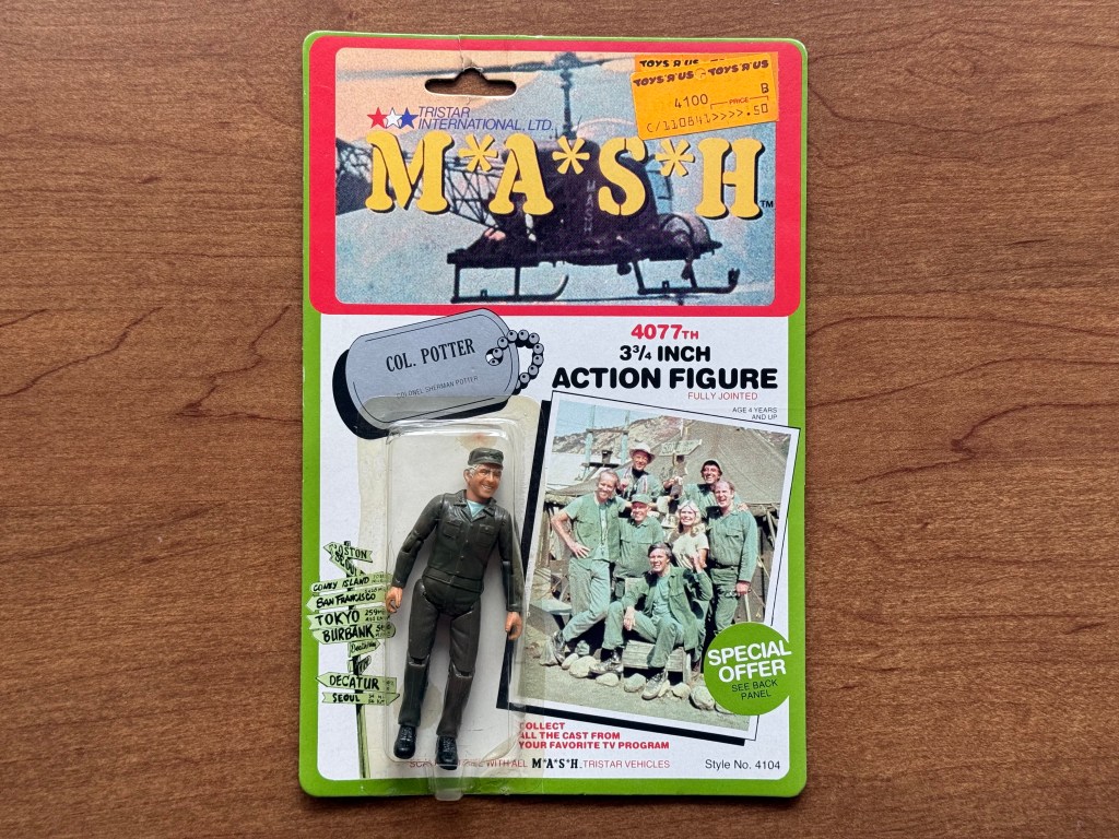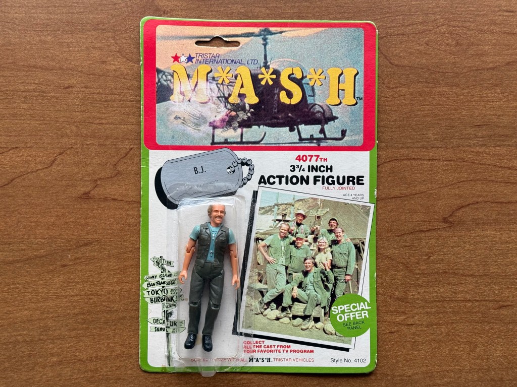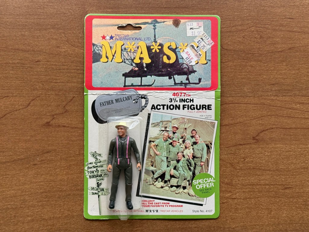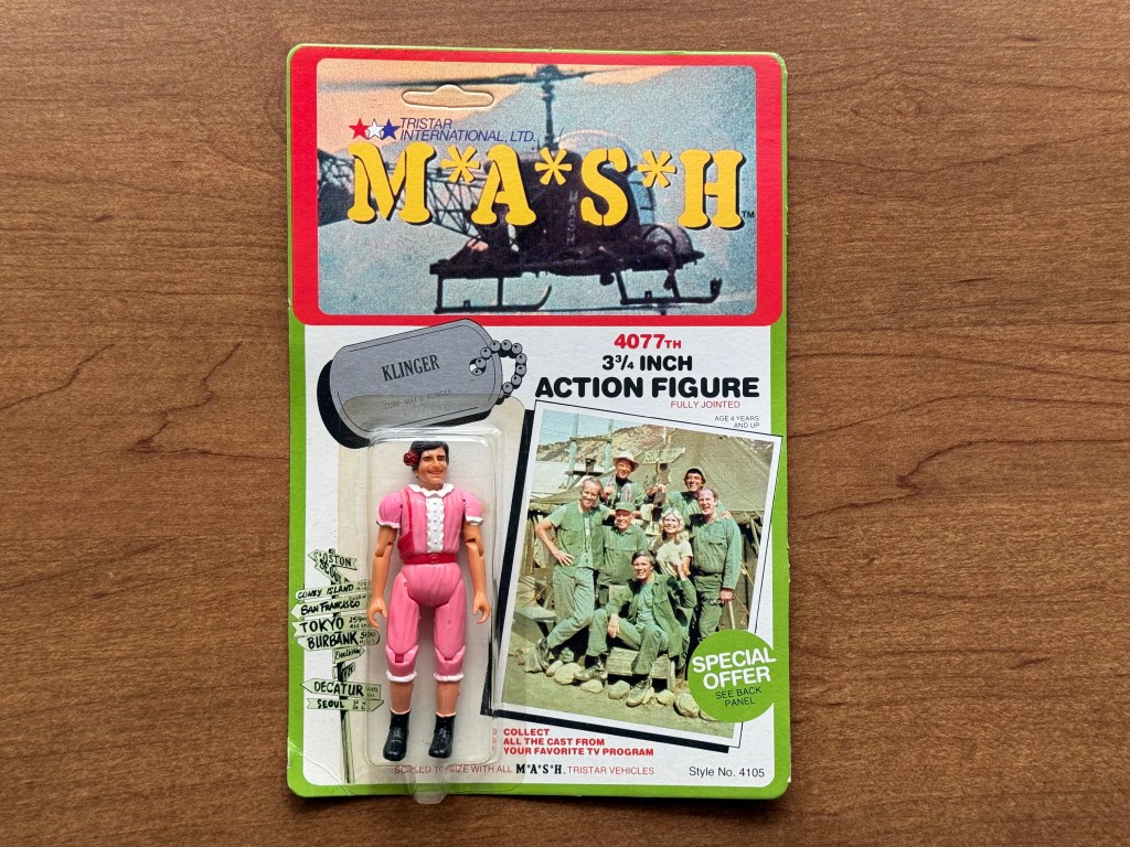 There was one action figure for each of the characters that were still on the show in 1982. What is interesting to me are the two different Klinger action figures with the same style number. The back of the product card doesn’t show a picture of the action figure of Klinger in fatigues. Was that one added later? Did it replace the action figure of Klinger in the pink dress? I have not found a lot of information about why both Klinger’s share the same style number. From the marketing pictures, the toys seemed to be geared more toward boys, so I wonder whether they were afraid that boys wouldn’t want to play with an action of figure of a man in a dress so they swapped out Klinger’s action figure for one of him in fatigues. Based on the current market price of the Klinger in a dress vs. the other action figures, it seems that the figure of Klinger in pink is more rare than the other characters.