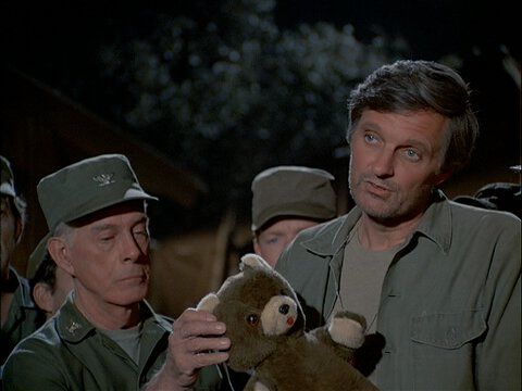 Radar’s iconic, one-eyed teddy bear made its first appearance in M*A*S*H in the episode “I Hate a Mystery” (01×10) when Henry is searching the camp for the items that had been stolen from various members of the 4077th. The bear then makes at least 16 more appearances including in “The Kids” (04×08), “Quo Vadis, Captain Chandler” (04×09), “The Gun” (04×13), “War of Nerves” (06×04), and “Goodbye Radar, Part II” (08×05) (RJ at mash4077tv.com has a great history of Radar’s teddy bear’s appearances in the series). It is the teddy bear’s final appearance in “Goodbye Radar, Part II” that is most memorable for me as Radar leaves the teddy bear on Hawkeye’s bunk in The Swamp. It was a fitting gift from Radar to Hawkeye, and it was a great metaphor for Radar growing up. Him leaving the teddy bear behind also fulfilled the prophecy by Dr. Sidney Freedman in “War of Nerves” in which he suggests that after the war, Radar probably won’t need a teddy bear anymore.