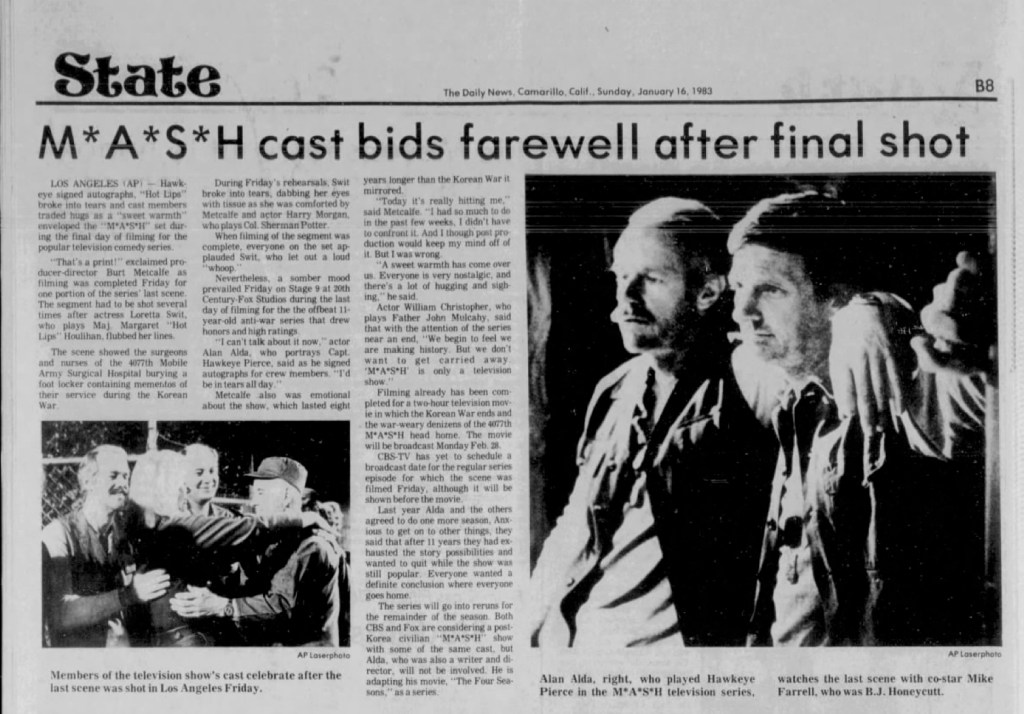 I also subscribe to newspapers.com, and I’ve found a lot of material in the newspaper to which my family subscribed when I was a teen, THE [Nashville] TENNESSEAN. There is a good article in the paper from Feb. 28, 1983, detailing MASH parties being held across Nashville & the whole country. I was a HS Senior at the time, and it was there that I found out that WNGE-TV (the local ABC affiliate that showed MASH reruns) would be preempting ABC’s program [THAT’S INCREDIBLE] to rerun the MASH pilot in the half-hour before we could watch the finale on CBS affiliate WTVF. This is the day when I first remember seeing the MASH pilot as a result. It’s a nice memory that my now late parents watched the whole 3 hours with me.