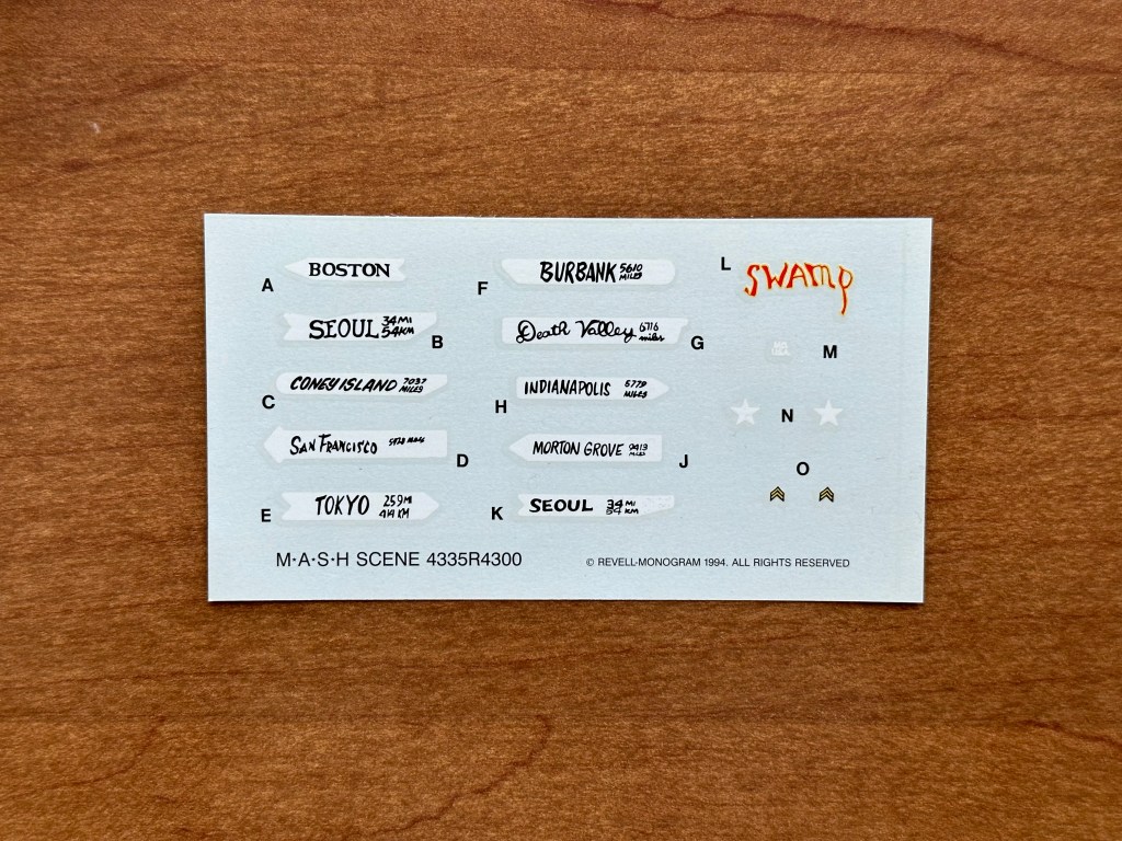 That’s not a bad thing though. The model’s instructions are well illustrated, and all you needed to build the model aside from the paint was model glue (which I can still smell). The set came with decals that you had to soak in water, apply, and then allow to dry to adhere them to the tiny plastic pieces. I don’t remember whether I was able to successfully apply the decals, but I do know that I have always had trouble with them! This scene had something else that was unique, and that’s a base. The base featured skid marks in front of the Swamp for the Jeep, rocks around the tent, and a place to put the signpost. There were not many model kits that I owned as a kid that were full dioramas like this Swamp set. Although, most of my models as a kid were of cars. Overall, I believe the Swamp model set is a really cool object. I do find it interesting that it was released in 1994, eleven years after the finale aired, but that is a testament to the staying power of M*A*S*H.