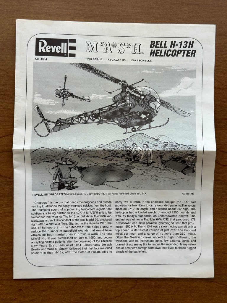 If there is one thing from M*A*S*H that is more iconic than the Swamp, then it has to be the Bell H-13 Sioux from the opening credits. Revell made a detailed model of the helicopter at the same time as they released the Swamp set. I did not own this model as a kid, so I don’t have the building experience, but I do really like the helicopter! The model does not include any extras such as character figures or a base. The model is fairly detailed and includes all the parts you need to build it including the decals for the markings, stretchers for the side, protectives bubbles for the wounded on the stretchers, and a clear plastic bubble for the cockpit. Like the Swamp, this is a “Skill Level 2” set, so in addition to full assembly being required, some painting was as well. Although, there isn’t as much painting on this set as there was for the Swamp since the helicopters were primarily painted olive drab.