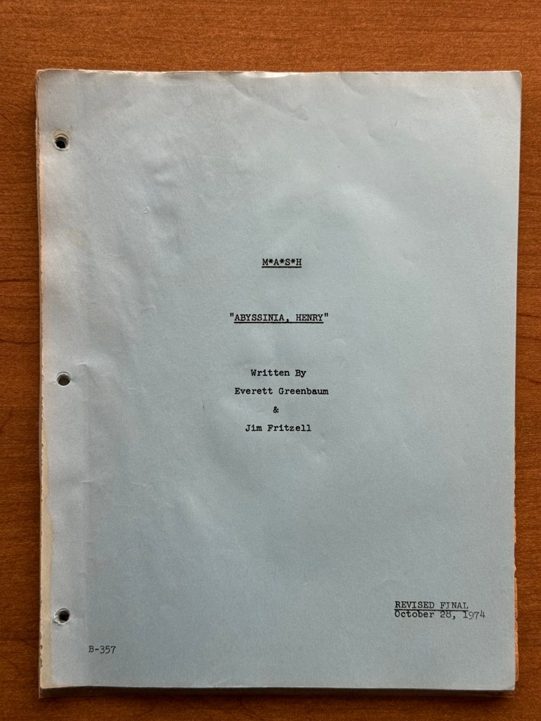 This script is a revised final draft dated October 28, 1974. While the end of “Abyssinia, Henry” was influenced by Gelbart and Reynolds, the episode was written by the writing team Everett Greenbaum and Jim Fritzell. They are credited with writing 24 episodes of M*A*S*H in seasons three through six. They would also write for AfterMASH. The episode was directed by Gelbart, which is fitting due to the importance of this episode. As I mentioned, the episode aired March 18, 1975, and we know this was the last episode filmed of the season because after the final scene was shot, there was a wrap party scheduled.