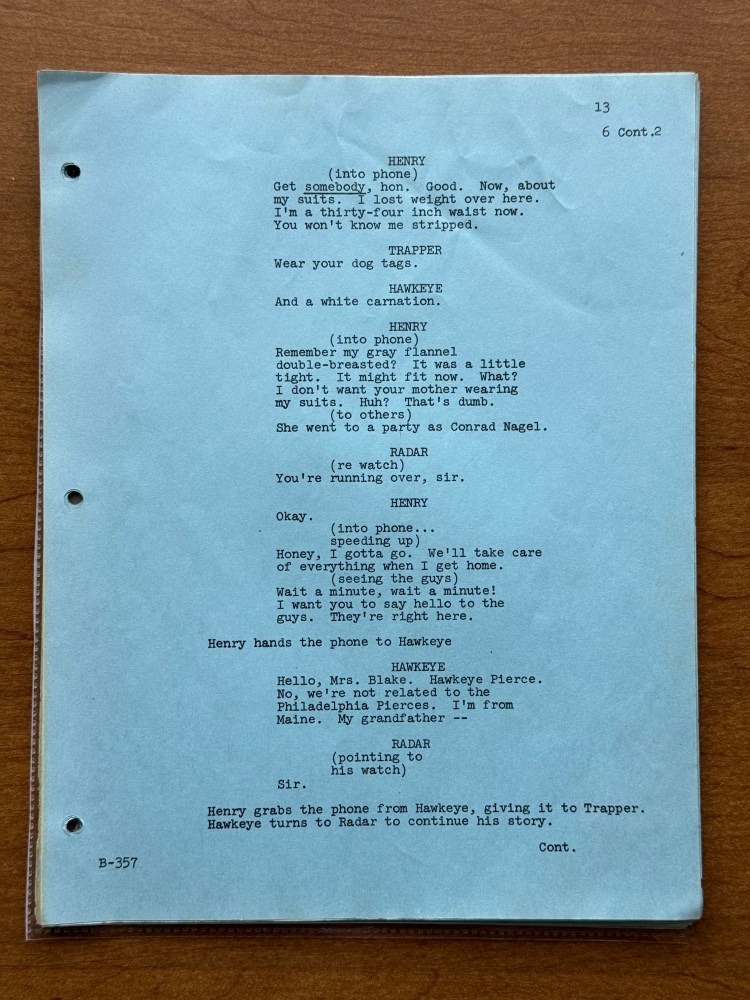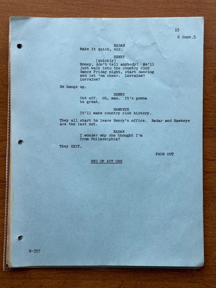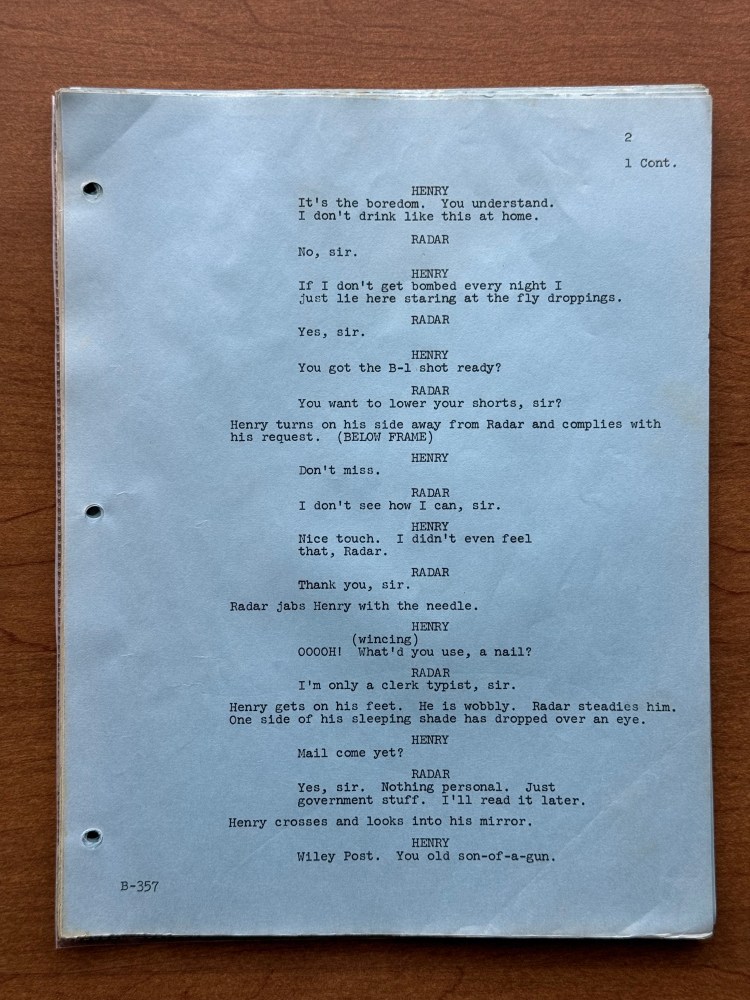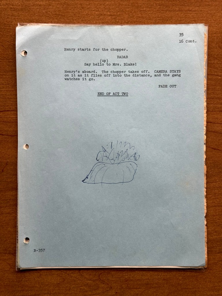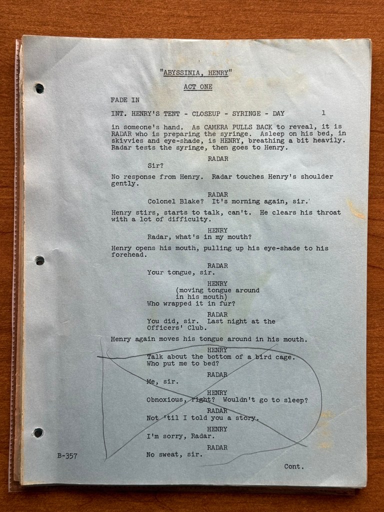 I noticed a few mistakes in this episode that are kind of unusual. At one point, Henry says that his wife has the most fantastic body in “downstate Illinois,” but Bloomington is in upstate Illinois, and it is written for Henry to say “upstate Illinois” in the script. There is also an issue with the time difference between Korea and the United States. Radar tells Henry that Illinois is fourteen hours ahead of Korea, but Illinois is actually fifteen hours behind of Korea. Beyond those two errors, there are surprising number of differences between the script and final episode. Being a revised final draft, I had assumed that it would be pretty close, but there were several changes besides the typical, minor wording changes the actors would make or the directors might have asked for in the moment. A list of the changes is below, and the page numbers correspond to the photos in the gallery above.