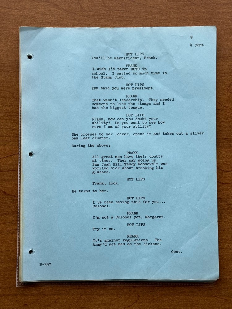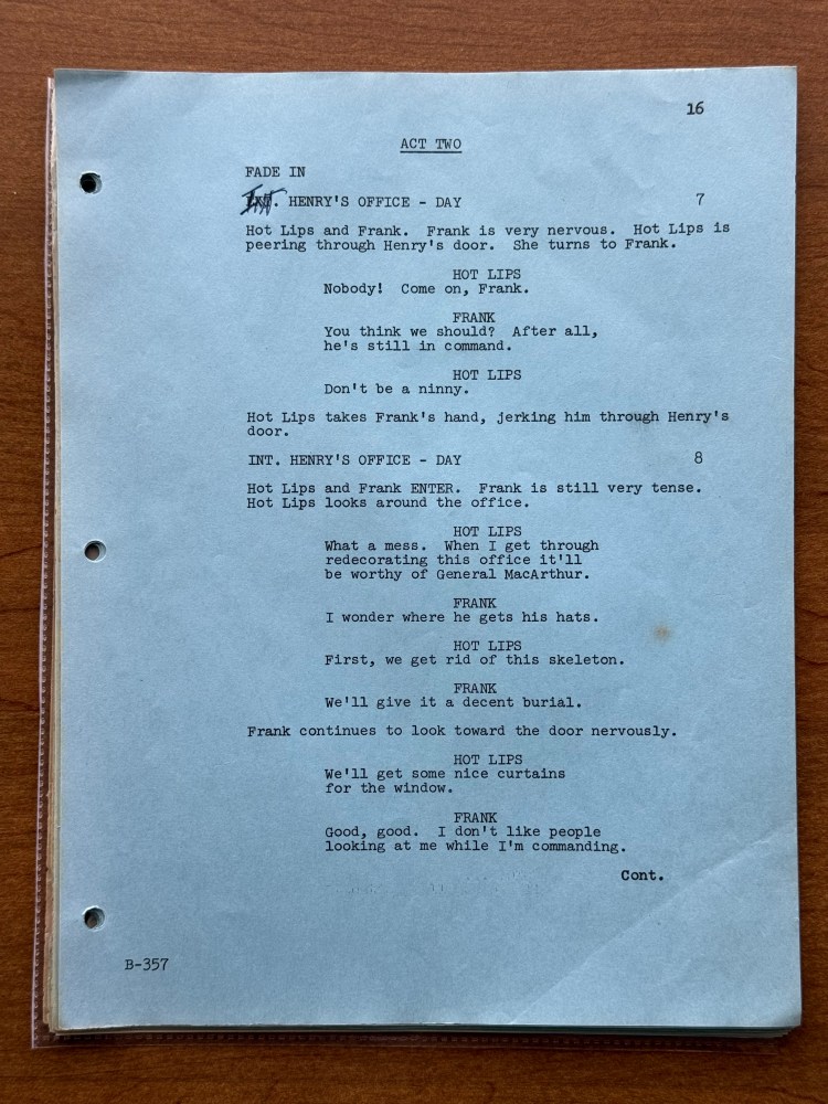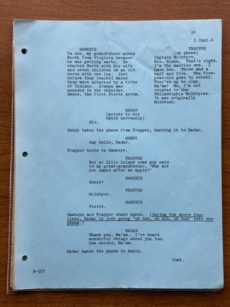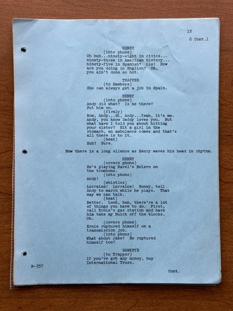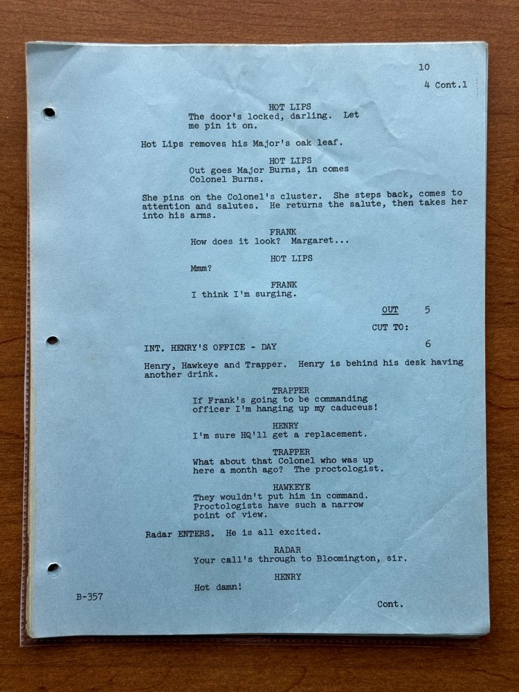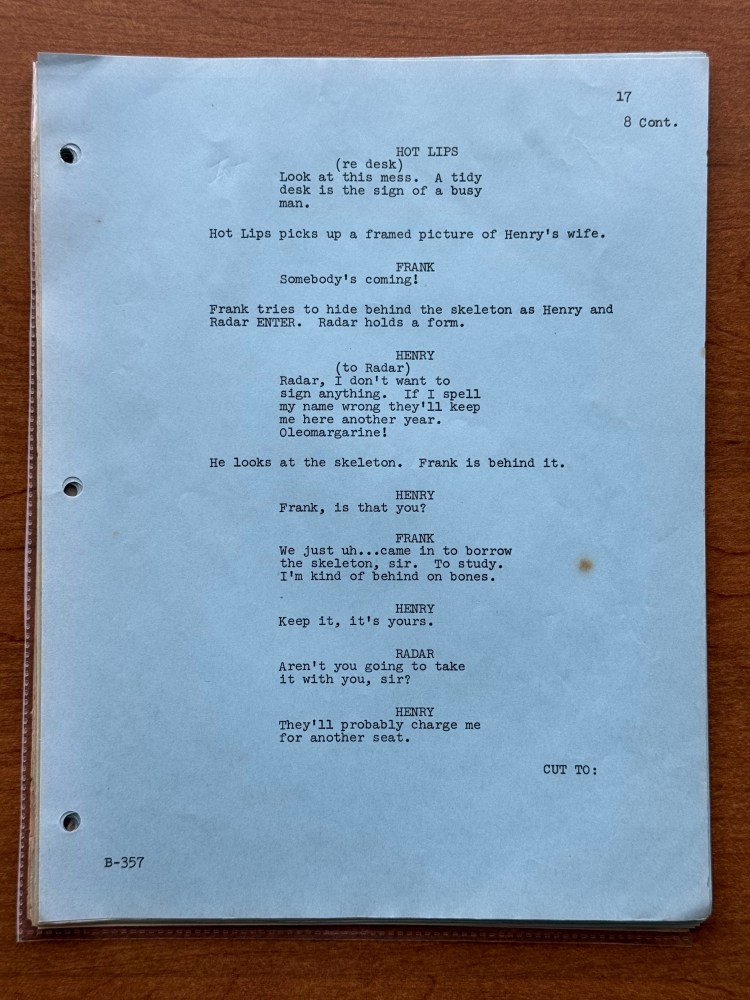 I noticed a few mistakes in this episode that are kind of unusual. At one point, Henry says that his wife has the most fantastic body in “downstate Illinois,” but Bloomington is in upstate Illinois, and it is written for Henry to say “upstate Illinois” in the script. There is also an issue with the time difference between Korea and the United States. Radar tells Henry that Illinois is fourteen hours ahead of Korea, but Illinois is actually fifteen hours behind of Korea. Beyond those two errors, there are surprising number of differences between the script and final episode. Being a revised final draft, I had assumed that it would be pretty close, but there were several changes besides the typical, minor wording changes the actors would make or the directors might have asked for in the moment. A list of the changes is below, and the page numbers correspond to the photos in the gallery above.