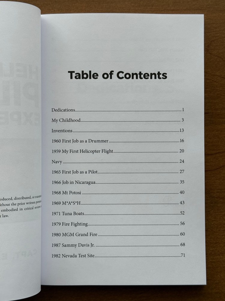 Poss’s book is very readable, and goes in chronological order with stories from his life and his 62+ years as a pilot. He discusses the first time he ever flew in a helicopter in 1959, and how he knew then that was what he wanted to do. While still in high school, he began taking lessons in a Bell 47D, and after graduating high school, he joined the Navy. Poss doesn’t just have his license to fly helicopters. He can also fly planes, and he has flown all over the world. He talks about his time in Nicaragua, Mexico, the Middle East, the Philippines, and more. In the United States, he has flown through the Grand Canyon, in Alaska, and he has fought fires and helped perform air rescues. He has flown just about everything, and his stories are fun to read. If you have listened to his interview on M*A*S*H Matters, then you know he is a good storyteller.
