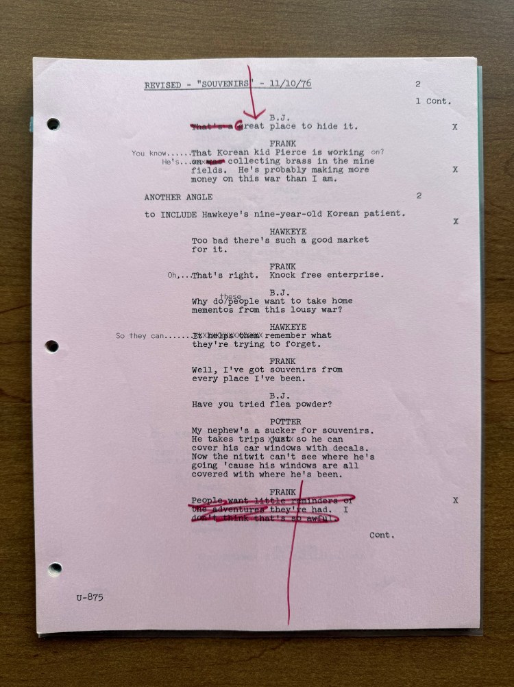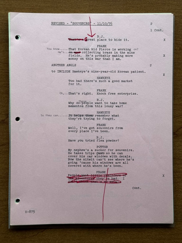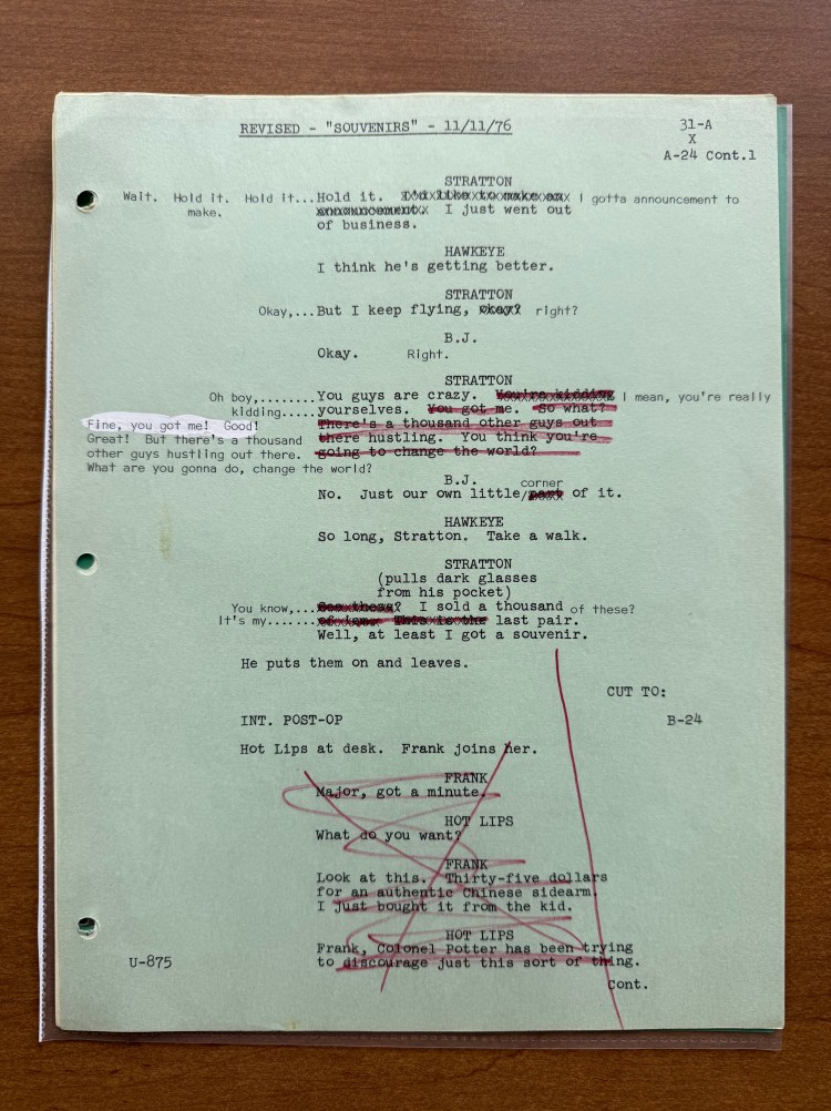 As we are well into May, and I have been rewatching M*A*S*H season five, I knew I had to choose an episode from the season to review. I am missing scripts for about half of season five, so that narrowed down my options. As I looked through the scripts in the collection, the cover of one really stood out. It was covered in writing and markings that I had several questions about. Thankfully, I was able to get answers to the questions, so I decided to write about the episode “Souvenirs” (05×22). I have several thoughts about this episode that I will get into later, but the script itself tells a very interesting story. This script was corrected and reviewed by Orven Schanzer for several post-production tasks. The script is heavily marked up with lines of dialogue marked out and typewritten corrections throughout the script. This copy of the script was corrected to match the dialogue delivered by each actor in the final episode that aired on CBS. In this week’s post, we’ll learn more about this script, why it was corrected, and why this episode left me confused.