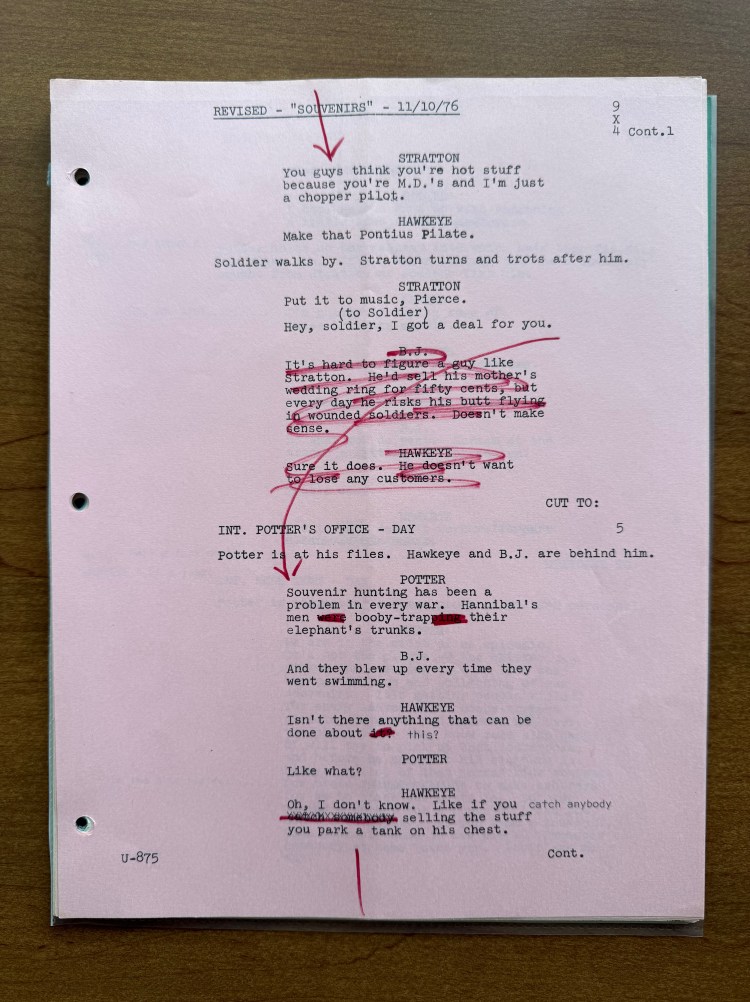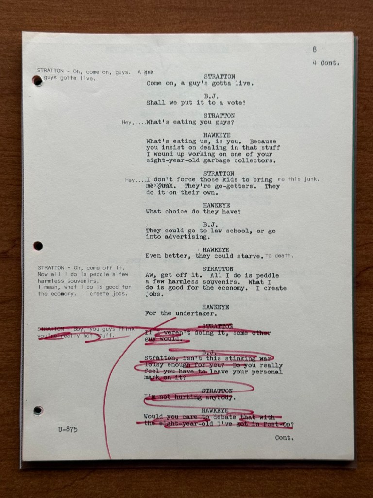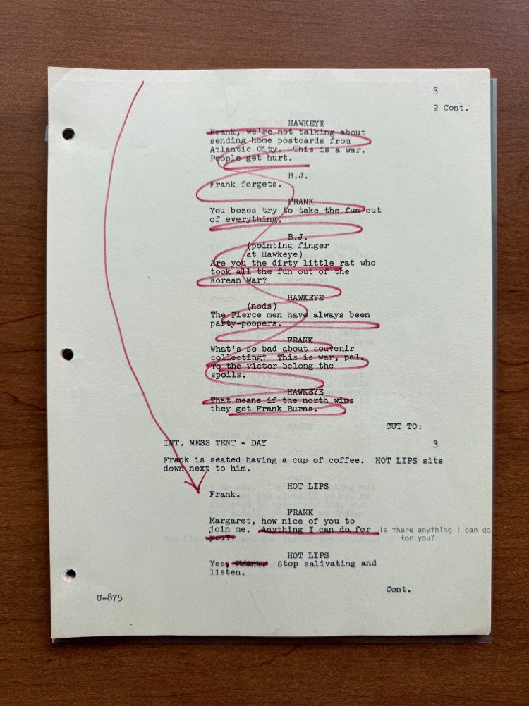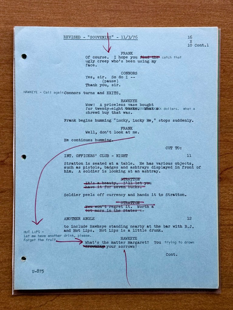Since this script is a corrected copy, there are not many differences, or rather, the differences are corrected. But since this script is a final draft that has been marked up, there were some scenes that were removed from the final episode. The opening O.R. scene was originally written to be longer (pages 2 – 3). One change that I found interesting was that Margaret didn’t originally put Frank’s hand in the oatmeal, she was going to elbow him (page 6). Perhaps this was changed since she punches Stratton later in the episode. The scene in the Mess Tent with Hawkeye, B.J., and Stratton was written to be longer (pages 8 – 9). There was a scene cut that showed Stratton selling products after Potter’s speech (page 16). There was a scene between Frank and Margaret cut (pages 31 – 32). I suspect that some of these cut lines/scenes were filmed, but cut for time.