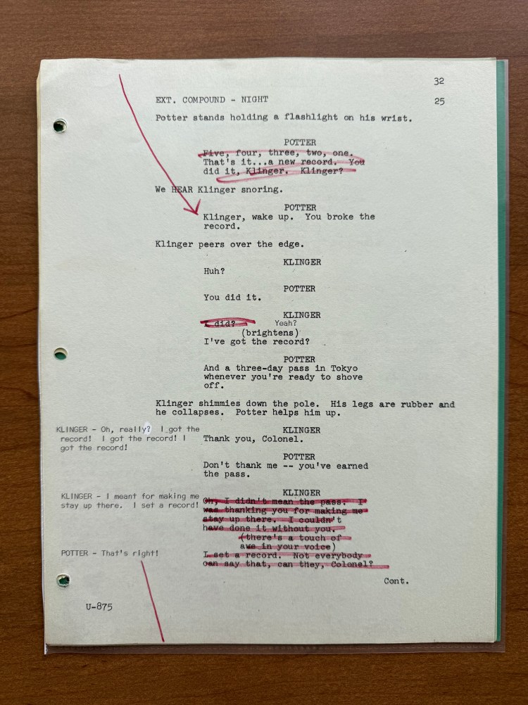 This script highlights an often forgotten task. Closed captioning is important to viewers who are hearing impaired. Having a script that matched the dialogue from the episode ensured the accuracy of closed captioning. I have watched shows with the closed captions on before where the captions didn’t exactly match what is being spoken by the actor. That is likely because a version of the script that had not been updated to reflect line changes was referenced when creating the captioning. The level of detail that went in to making an episode of M*A*S*H accessible to everyone in the audience went far beyond blocking, lighting, and filming. There are people who worked behind the scenes to ensure that everyone in the viewing audience could enjoy an episode of their favorite show, and this script highlights one of the tasks that was undertaken behind the scenes to ensure that was possible.