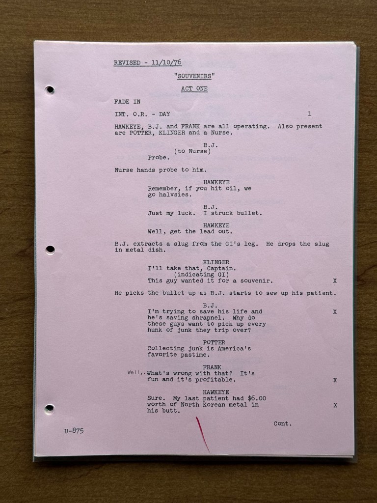 This is a “Final” draft of the script dated October 15, 1976. The final episode aired on CBS on March 1, 1977. The teleplay was written by Burt Prelutsky and the story credit is shared by Prelutsky and Reinhold Weege. Prelutsky has eight writing credits for M*A*S*H, in seasons four through six, including this episode. This is the only M*A*S*H credit for Weege, but he is better known as the series creator of Night Court. “Souvenirs” was directed by Joshua Shelley, and this is his only M*A*S*H credit as well. Perhaps the fresh writer and director is part of the reason why the episode felt so different for me?