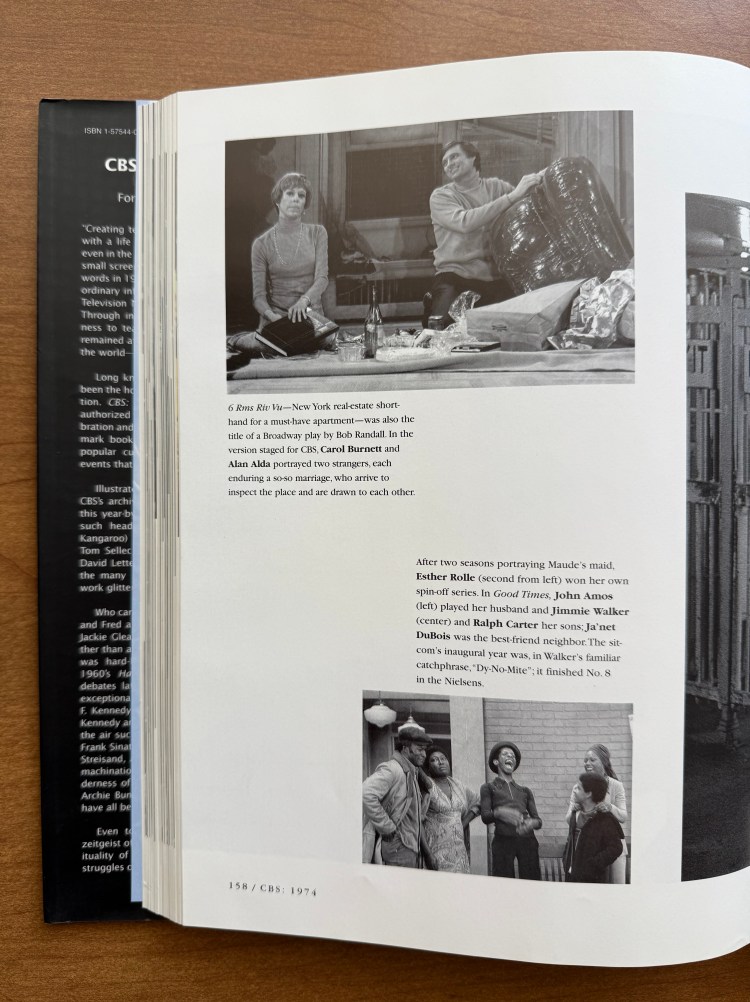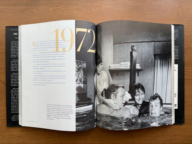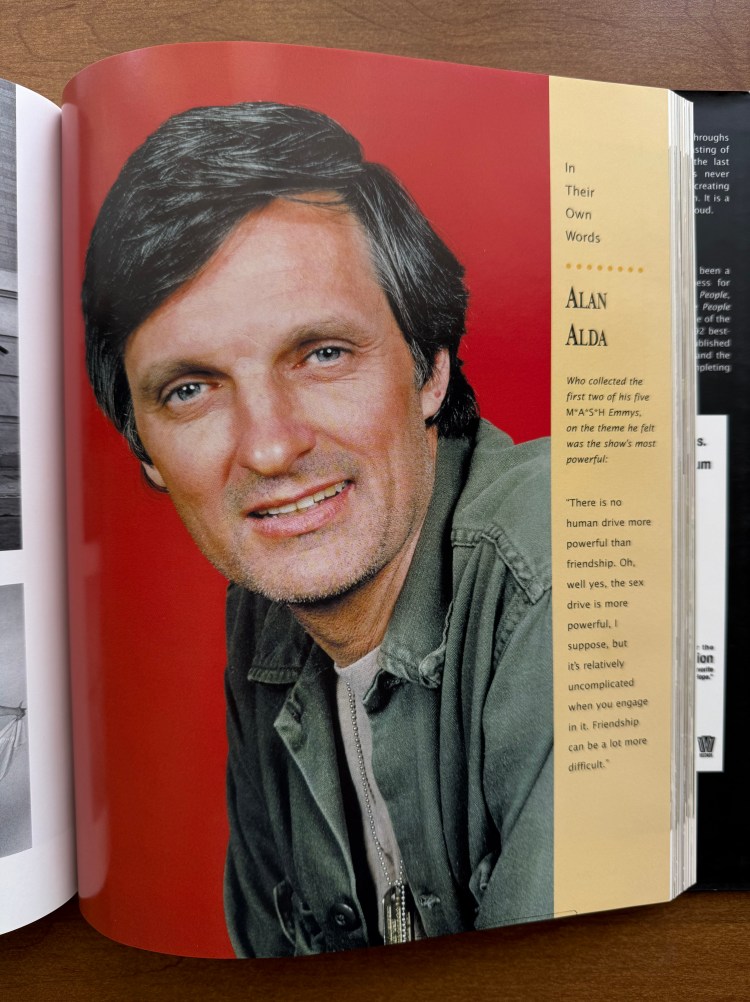 Of course, M*A*S*H appears in CBS: The First 50 Years, but only briefly. For each of the years, there is one show that is highlighted, and for 1972, Chiu highlights M*A*S*H. The spread features a photo from the episode “Henry, Please Come Home” (01×09) and features McLean Stevenson, Alan Alda, and Wayne Rogers in a Tokyo bathhouse. The blurb discusses how M*A*S*H was developed for television from the original movie and how the series ran eight years longer than the Korean War. It’s a short writeup, but it gets centerstage for 1972. There were a few other shows that debuted in 1972 that I did not realize were on CBS. The Waltons (1972 – 1981), Maude (1972 – 1978), and The Bob Newhart Show (1972 – 1978) all debuted the same year as M*A*S*H, and they are among some of the most popular shows on television. There is one other brief mention of M*A*S*H in the book when they feature a quote from Alan Alda on friendship. As a M*A*S*H fan, this book helped me place the series in perspective and understand its place in CBS, and television history.