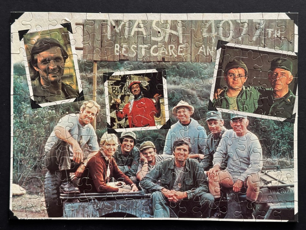 The company H-G Toys specialized in creating licensed products for a variety of television shows and properties including Happy Days, Star Trek, Planet of the Apes, Evel Knievel, Spider-Man, and more. In 1976, they released three puzzles that featured the cast of M*A*S*H. Since the puzzles were released in the timeframe of, what I would call, the mid-cast of M*A*S*H, the puzzles feature Hawkeye, B.J., Margaret, Col. Potter, Radar, Frank, Klinger, and Father Mulcahy. Each puzzle is 150 pieces and measures 14 inches by 10 inches when assembled. The puzzles feature one primary image with three or four inset images featuring other members of the cast. The photos used appear to be press photos for the most part, but there are two identifiable scenes in one of the puzzles. The image of Hawkeye and Klinger (wearing a pink dress) is from the episode “Hawk’s Nightmare” (05×13), and the basketball scene on the same puzzle is likely from “Margaret’s Marriage” (05×24). The two puzzles in the collection aren’t the only M*A*S*H puzzles made by H-G Toys in 1976. According to MASH4077TV.com the three H-G Toys puzzles include: