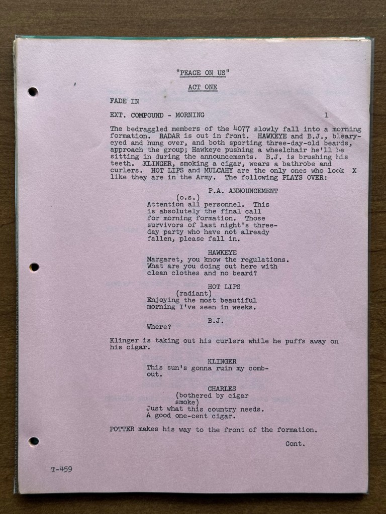 As I began my rewatch of M*A*S*H season seven in July, I knew I had to select a script to write about this month. For me, there was only one choice. Not because it is my favorite episode of the season, but because I have always wondered why the second episode of the season was when they seemingly first introduced B.J.’s mustache. No one was surprised by the mustache in “Commander Pierce” (07×01), but in “Peace on Us” (07×02), that is when B.J. shaves his beard but leaves the mustache. That led me to wonder whether the episode “Peace on Us” was written before “Commander Pierce,” and it was! It is true that episodes are not always filmed in order, but they typically air in a certain order if the storylines dictate it. So my theory is that “Peace on Us” was intended to be the season seven premiere episode. However, something prevented it from being ready on time, so they had to adjust the order of the episodes. Let’s take a look at the script to see if that proves to be true!