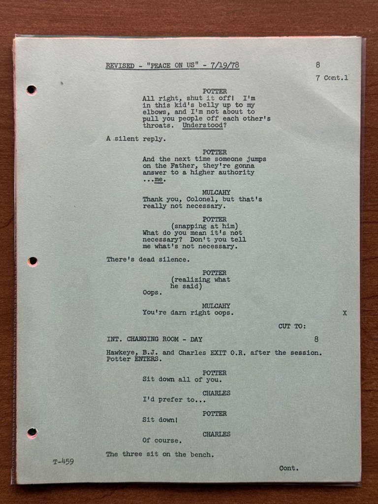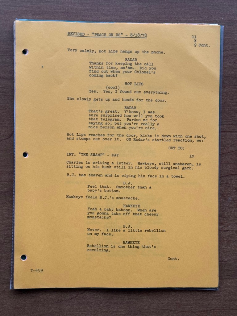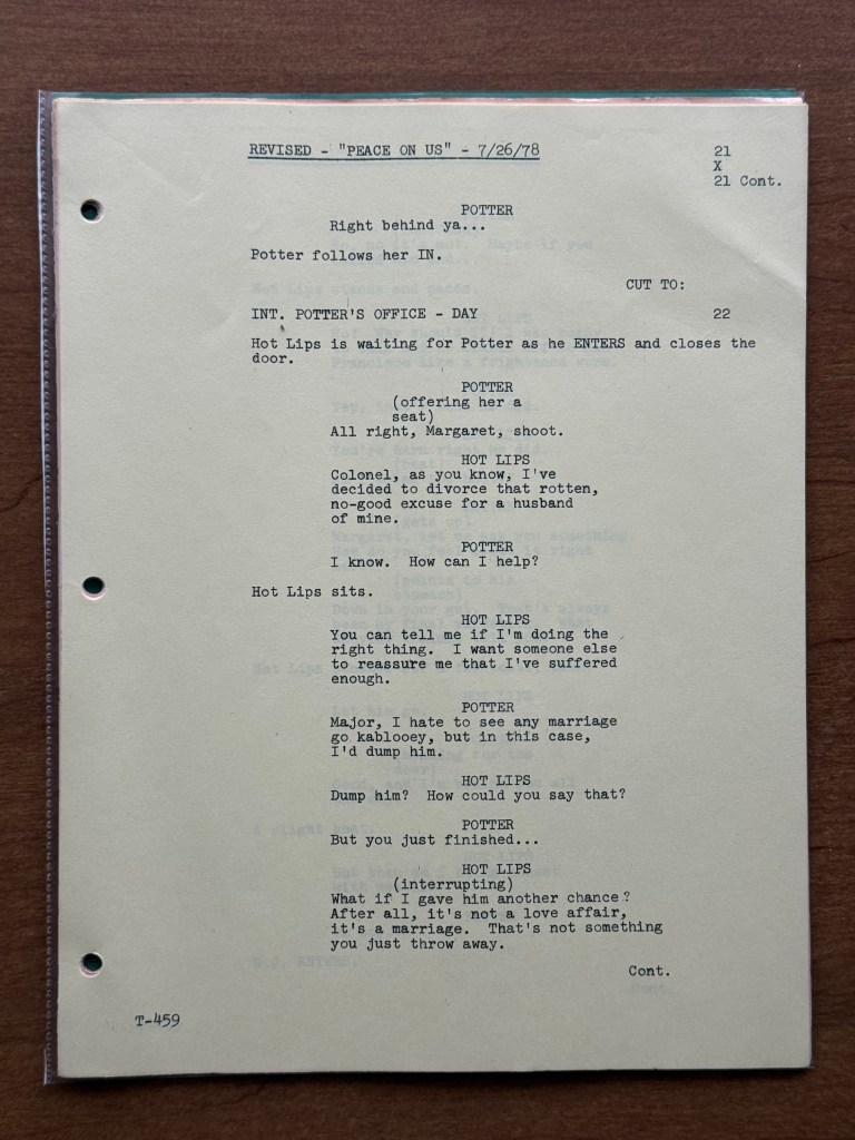 After reviewing the script and rewatching the episode, I do believe that “Peace on Us” was intended to be the first episode of season seven. It was the first script written (the script for “Commander Pierce” is dated July 26, 1978), and it set up several storylines that would play out over the coming season. However, I believe that the revisions and scene changes made in mid-August caused a delay in having the episode ready for premiere week on CBS. I remember watching this episode in the mid-2000s, and being confused by why B.J. was talking about his new mustache in this episode when he clearly had a mustache at the start of the season in “Commander Pierce.” While this script does not contain the production documents to provide more clues, I believe that the revised pages from August 18, 1978 offer the decisive answer. If filming had completed in late July only to have a revised scens filmed a few weeks later, the episode would have to be re-edited. In the late 1970s, that meant reworking the film, and that took time. We all know that the M*A*S*H timeline can be difficult to follow at times, but I think the issues between the timing of “Commander Pierce” and “Peace on Us” can be chalked up to production challenges.