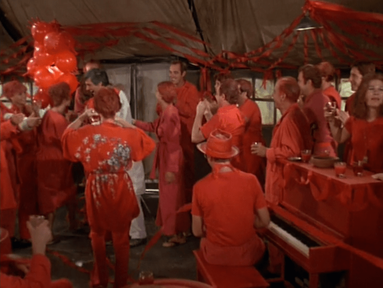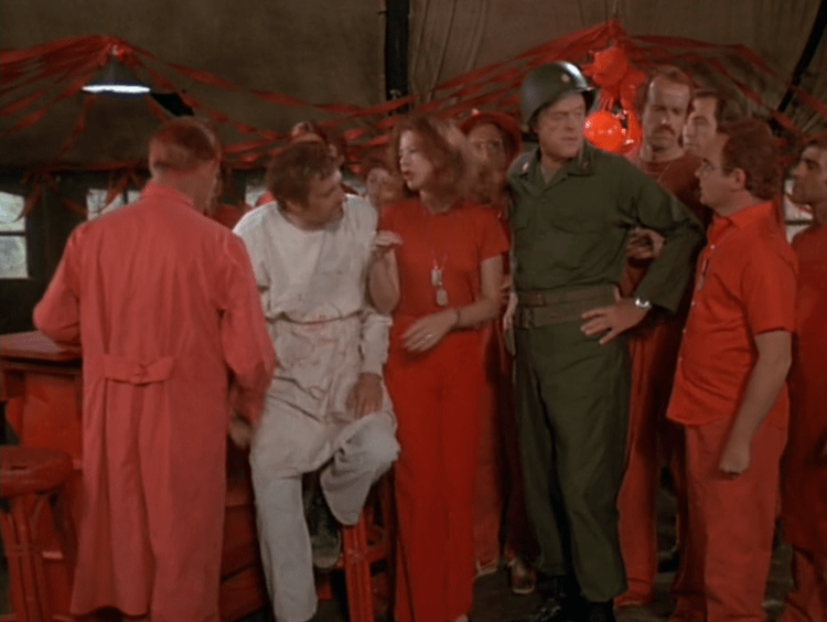 The episode opens with Col. Potter calling everyone to formation in the compound. He announces that the peace talks in Panmunjom have stalled, but that everyone will be rotated home as soon as they have the required number of service points. That puts everyone into a sour mood, and the case of the grumps carries in to the O.R. Potter tries to put a stop to the infectious bad mood, but he delivers more bad news in that the number of service points required to be rotated home increased. This makes Hawkeye so angry that he drives to Panmunjom to address the peace talks himself. He manages to get admitted to the talks, says his peace, and goes back to the 4077th. Meanwhile, Margaret tells Hawkeye that she is going to Tokyo to meet with Donald to work out their differences. However, she finds out that he requested a transfer to San Francisco to avoid working things out with her. She ultimately makes the decision to divorce Donald Penobscott after talking to Hawkeye and Col. Potter. After Hawkeye returns from the peace talks, the camp’s mood is lifted, and they have a “red party” where they’ve dyed everything red from their clothes to their hair!