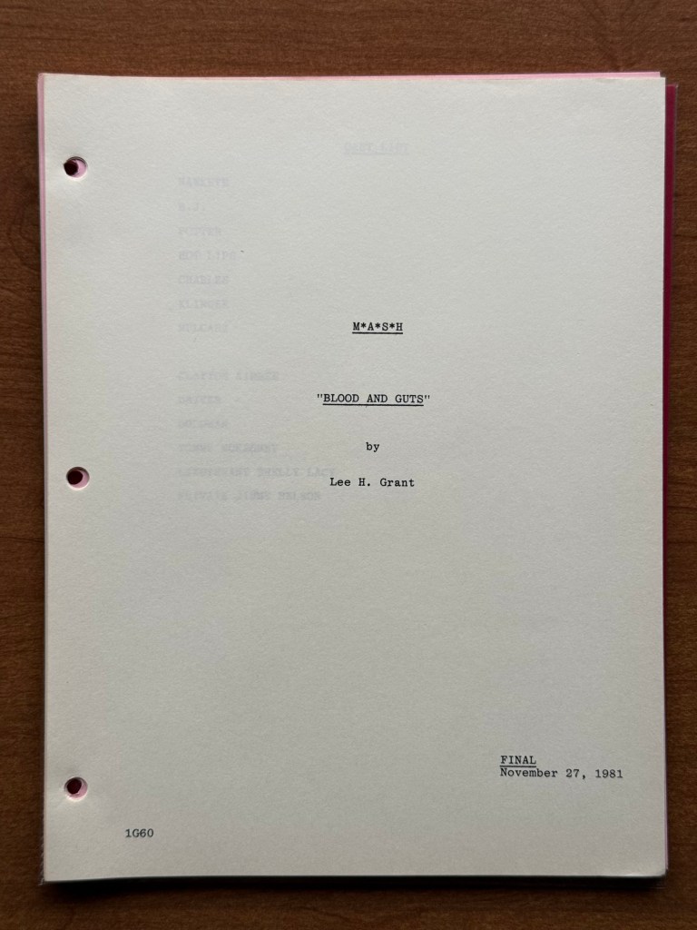 My copy of the script is a Final draft dated November 27, 1981. The episode was written by Lee H. Grant, and this is his only writing credit for M*A*S*H. He has a few other writing credits for shows including CHiPs and Barney Miller. Most of his credits are for other positions behind the camera including first assistant director and stage manager. “Blood and Guts” was directed by Charles S. Dubin, a very familiar name for M*A*S*H fans as he directed over 40 episodes of the series. The episode originally aired on CBS on January 18, 1982.