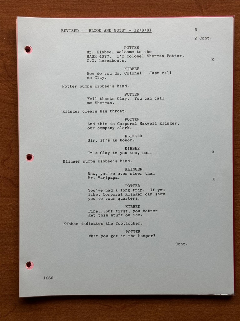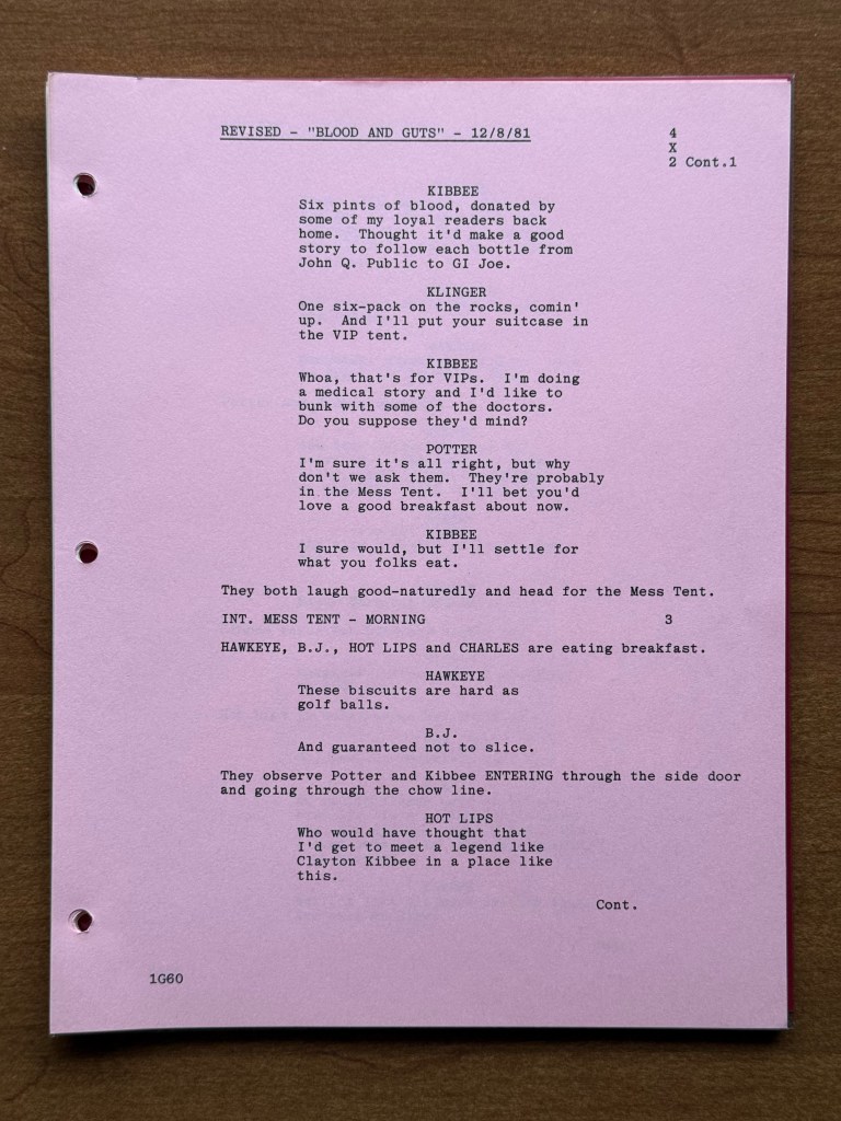 There were quite a few of revised pages in this script. Some episodes have a revised page here or there, but this one has blocks of revised pages that seem to be entire scenes. I’d like to see an original draft to see what did change. Was there originally a B-story that was cut for time? The Clayton Kibbee storyline has several subplots that take place at the same time, so I could see the writers deciding that a B-story was not necessary. It was unusual for M*A*S*H to not have a second storyline, however. As I’ve mentioned many times, each script is unique and tells a story. If I could find a script for “Blood and Guts” with production documents or without the revised pages, it would be able to answer several of the questions I am left with.