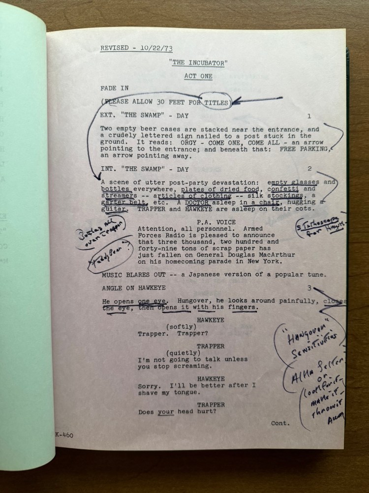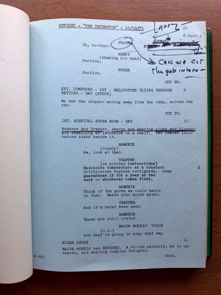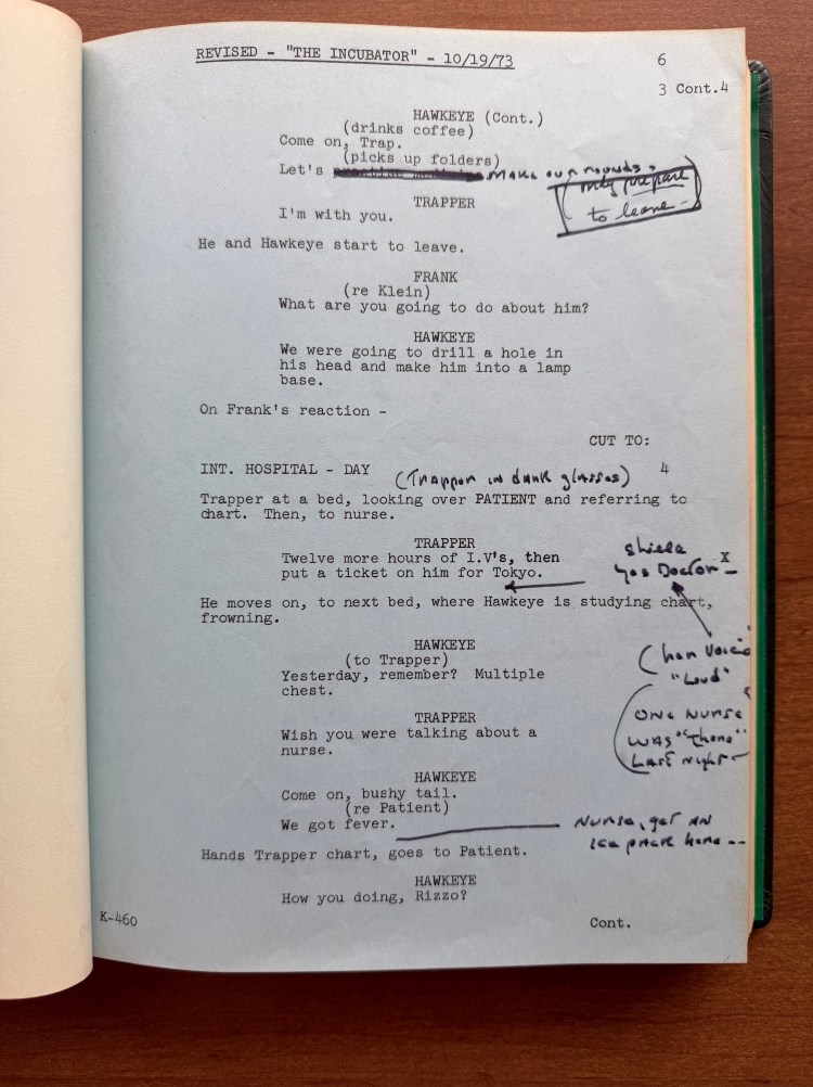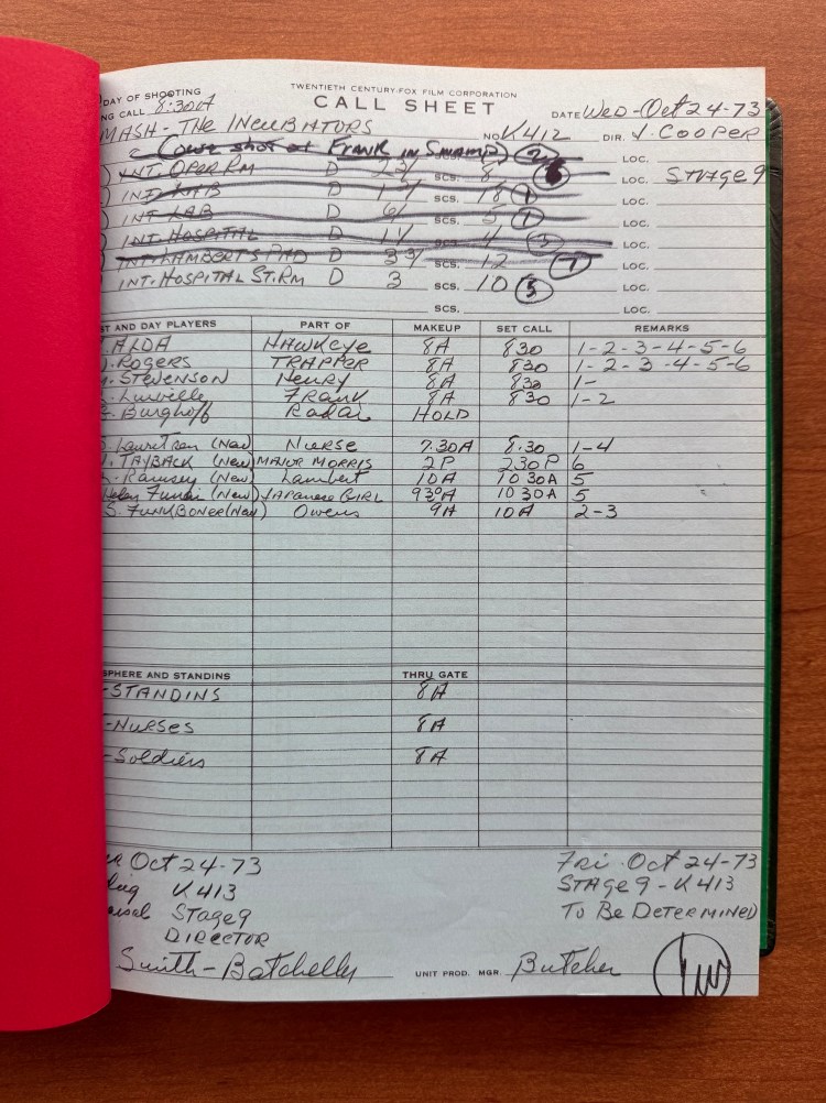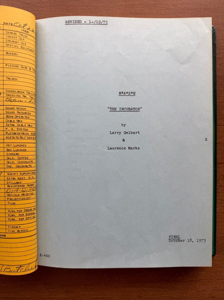 Speaking of Cooper, this script belonged to him! Cooper had all of his scripts from M*A*S*H bound into three volumes, and the script for “The Incubator” is in volume three. I have previously written about other scripts that belonged to Cooper (“The Sniper” (02×10), “Hot Lips and Empty Arms” (02×14), and “The Choson People” (02×19)), and like those, there are a lot of details in each script. This script contains the Call Sheets for each day of filming; however, the full Shooting Schedule is missing for this script. Other scripts in his collection do have that bound with the scripts. The script also contains two sets of revised pages dated October 19, 1973 (blue) and October 22, 1973 (pink). What appears most throughout the script are Cooper’s notations. He underlined important details of each scene, marked subtle line changes, added notes about camera angles, etc. The backs of some pages also have the length of scenes in minutes and seconds as he calculated how close they were getting to the 26 minutes of allowed television time. Cooper was very detailed, and by many accounts (including his own), very controlling. He saw himself as the boss of the set, and his scripts illustrate how into the weeds he was.