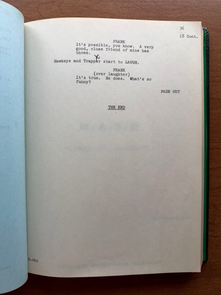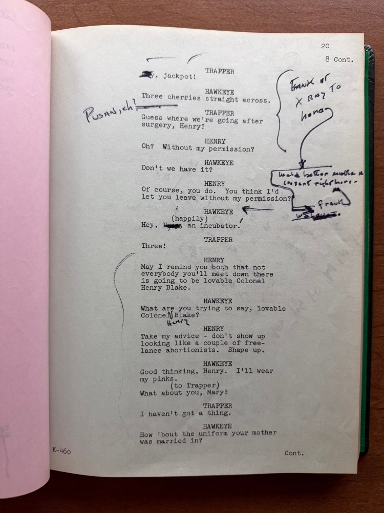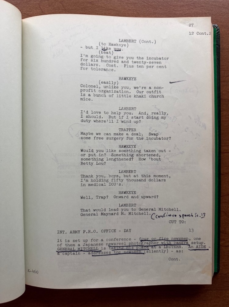 Cooper, and the M*A*S*H cast, have both written about and discussed the tension behind the scenes between the cast and the director. I have also written about Cooper’s attitude towards M*A*S*H as expressed in his autobiography. While I don’t doubt that there was a tension due to Cooper’s directing style, I can’t help but admire the work that they were able to achieve despite that tension. When watching any of the thirteen episodes Cooper directed, there is no hint of the drama that unfolded behind the cameras. Perhaps that is due to exaggeration on the part of Cooper, but either way, it illustrates the professionalism of the M*A*S*H cast and the crew to not only complete the thirteen episodes, but generate some fan favorite episodes. As I mentioned earlier, Cooper won an Emmy Award in 1974 for the episode “Carry On, Hawkeye” (02×11). His scripts are well preserved and notated which offers some unique insights into the life of a director on the set of M*A*S*H.