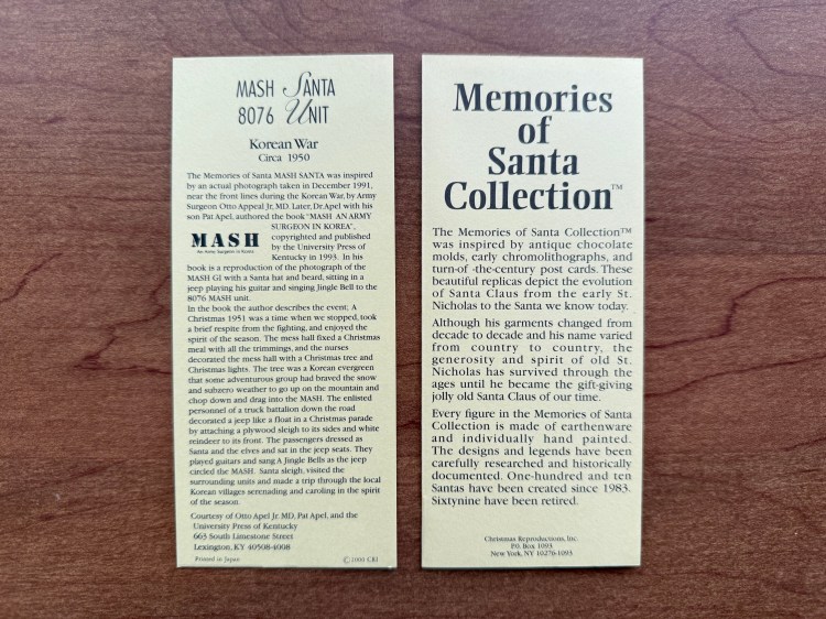 The “Memories of Santa Collection” was produced by Christmas Reproductions, Inc. between 1983 and 2003. According to sources, the company made 139 Santa and St. Nicholas ornaments representing the depiction of Santa Claus from different countries around the world. Many of them commemorate an event that involves either Santa or St. Nicholas. In 2000, a Memories of Santa ornament was produced commemorating the 8076th MASH in Korea and the Christmas of 1950. The ornament was inspired by a photo in the book, MASH: An Army Surgeon in Korea, by Dr. Otto Apel and his wife Pat. In the book, Dr. Apel describes how, in 1950, the 8076th MASH celebrated Christmas by decorating a Jeep to look like Santa’s sleigh, complete with a reindeer! Sitting inside, someone dressed as Santa with a guitar and played Christmas carols. This story inspired the ornament released by the Memories of Santa Collection which depicts a Santa sitting on the hood of a Jeep playing a guitar. The date “1950” appears on the bottom of the ornament, and “8076 MASH” is displayed on the bumper of the Jeep. It is a unique way to remember the moment.