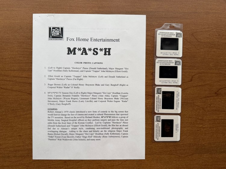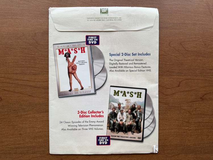 As a fan who purchased these DVDs as they came out every six months between 2002 and 2006, I am excited to have this press kit in the collection. It is an important story of how fans could interact with M*A*S*H in a new way. When M*A*S*H originally aired from 1972 to 1983, being able to watch your favorite show any time you wanted was unthinkable. Fans watched M*A*S*H when it aired and, if they were lucky, when the episode reran in the summer. Over the following decades, they could watch the show in syndication or buy the Columbia House VHS tables. In the early 2000s, classic TV shows were being released on DVD for fans, and it allowed them to own their favorite shows and share them with others. Of course, M*A*S*H is streaming today and can be watched whenever we want, but owning a full series on DVD was a novel concept in 2002. The announcement of M*A*S*H being released in collections by season was a big deal, and this press kit was a great way to promote it. There are fun facts about the show in the press kit, but the inclusion of the DVDs of the movie and disc one of the series was enough to get reviewers interested and enlist their help in getting the word out. I’ve looked on IMDb at the episode guide for Siskel & Ebert, and I cannot find any evidence that they discussed this release in January 2002, but I remember their show being more focused on new movies and not the release of classics. Perhaps that is why this press kit has remained in tact for over 25 years!