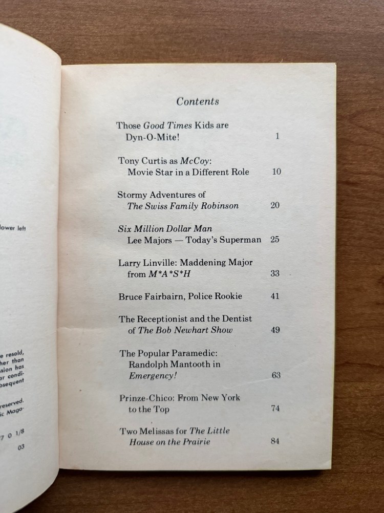 I have always been advocate for encouraging children to read, and that has long been the mission of Scholastic. So whether a child is interested in fiction, non-fiction, literature, or reading about their favorite television shows, the more they read, the better they get at it. Offering books about popular culture was a great way to connect fans with popular shows and encourage children to read (while making a profit for the company). In TV’s Top Ten: Shows and Their Stars, Herz offers well written and well researched information about the top TV shows of 1976. This is not the only book like this that Scholastic published. I will feature more of Scholastic’s books that feature M*A*S*H in the coming months, and I have previously discussed Herz’s M*A*S*H focused book, All About M*A*S*H, from 1975. Scholastic and Herz developed a formula for books focused on television, and it worked well. I have seen pre-owned copies of this book sell on used book sites in the past, and it is a fun book to add to a M*A*S*H or television history collection.