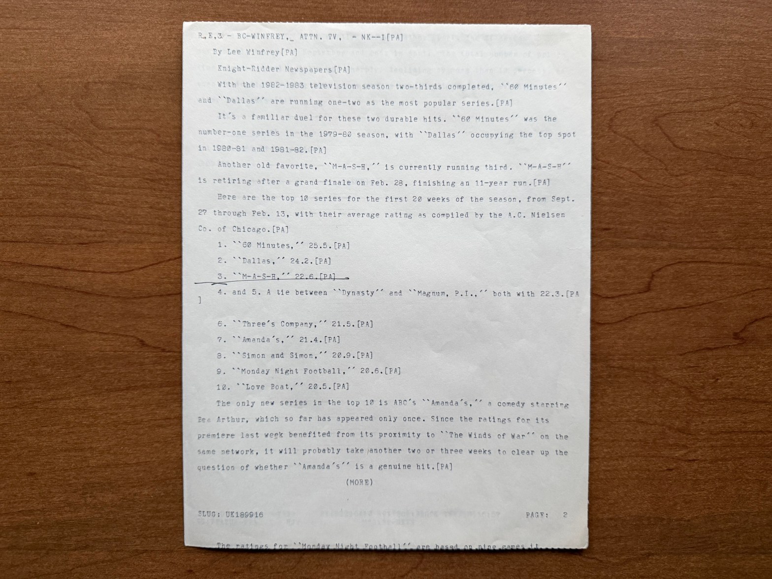 M*A*S*H had respectable ratings in each season but its first. Famously, M*A*S*H was near the bottom of the ratings rankings in its debut season, but fans caught the reruns over the summer of 1973, and they tuned in for season two. After that, M*A*S*H had solid ratings, but it was never a dominant show in the ratings (see a great summary of the weekly Nielsen ratings of M*A*S*H on MASH4077TV.com). But the hype of the final season definitely provided a bump. In this draft of a syndicated article by Lee Winfrey dated February 16, 1983, Winfrey reveals the top ten rated shows so far that season. This calculation, released by Nielsen, took an average of the ratings for the first 20 weeks of the season. In that ranking, M*A*S*H placed third behind the popular news program 60 Minutes and the evening drama, Dallas. In fact, the record broken by M*A*S*H for “Goodbye, Farewell and Amen” was previously set by Dallas for the famous “Who shot J.R.” episode in 1980. M*A*S*H was ahead of all other sitcoms and even the popular Monday Night Football. This was a very respectable showing for M*A*S*H as it was the highest rated 30 minute show of the season to that point, and the next highest in the lineup is Three’s Company in sixth place. The article goes on to point out that the top ten was dominated by CBS, the network on which M*A*S*H aired.