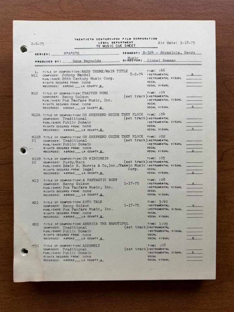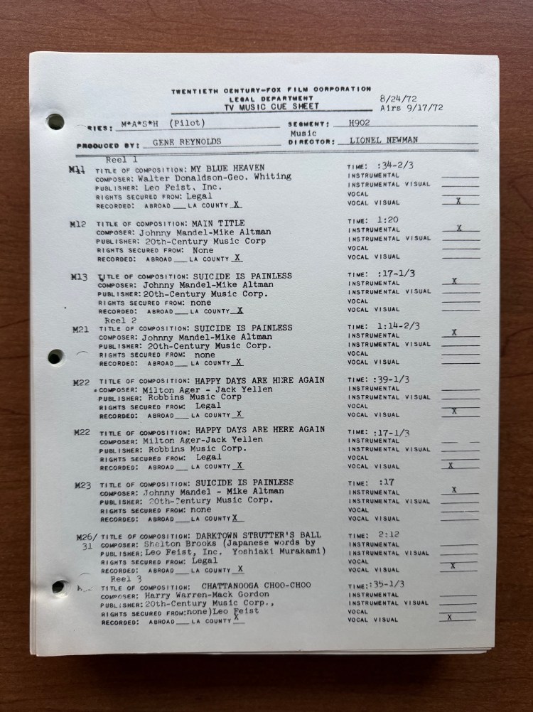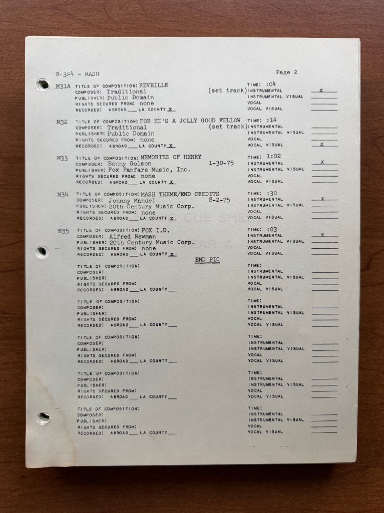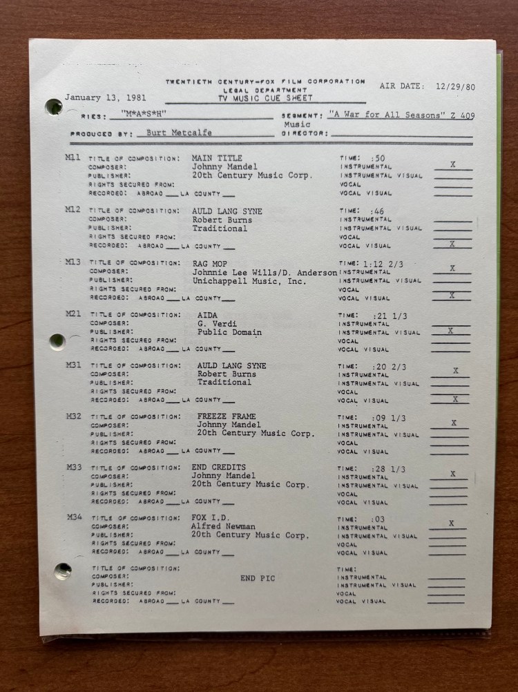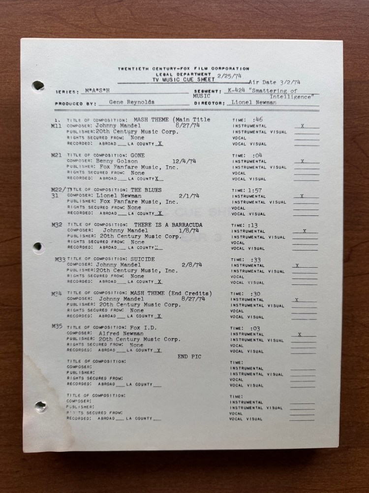 M*A*S*H ran for 251 episodes, and there is a sheet for every episode (I hope to find a set of cue sheets for season eleven someday). These sheets contain a lot of information, and they have been very useful in my own research. I have used the music cue sheet to find out a title of a song when asked by fellow fans, and I have used them when I am curious for myself. In collecting and preserving the production history of M*A*S*H, these documents are invaluable because they list more detail about the music used in the series then you can find in the closing credits of each episode. They also tell a fascinating story of how Fox’s legal division had to track the usage of all the music the series used to ensure proper royalties were paid to the owners of the music. The one story that these cue sheets remind me of is that Mike Altman, who wrote the lyrics to “Suicide is Painless” as a teenager, earned more in royalties from writing the music then his father did for directing the movie. It’s easy to see why. The theme song was played twice per episode, and he would have likely been paid royalties each time an episode is re-broadcast. These documents are part of the paper trail that ensured that Altman, and every other composer of a piece of music used in M*A*S*H was paid their royalties.