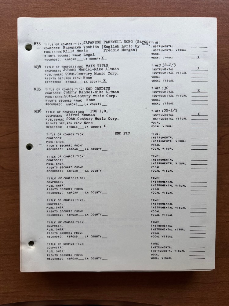 - Rights Secured From: This line is interesting because it lists who they had to got permission from to use the song. Sometimes it lists “none” since the music was owned by 20th Century Fox. Other times it just says “legal” because Fox’s legal department would have worked out an agreement with the holder of the rights.