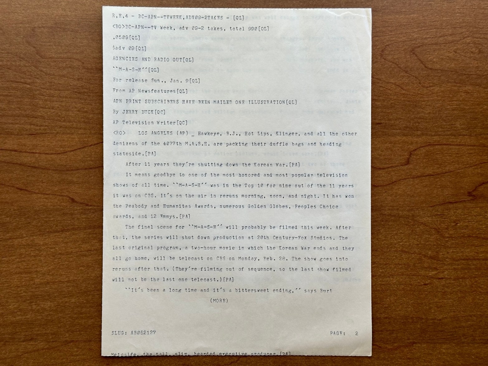 In December 1982, 42 years ago, M*A*S*H was winding down. It had been announced that the eleventh season would be the last for the series, and the end was near. Publications were gearing up for the anticipated finale with articles, and in late December 1982, Associated Press (AP) Television Writer Jerry Buck penned an articleContinue reading “Press Pass 39: “M*A*S*H Heading Stateside””