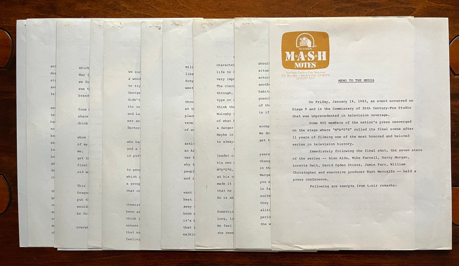 This month, several posts will relate to final days of filming the series in January 1983. We continue this week by looking at the press release following the press conference after the final scenes were filmed. UPDATE (December 5, 2022): The page of quotes from David Ogden Stiers has been found! I wrote a fullContinue reading “Press Pass 4: M*A*S*H Wrap Quotes”
