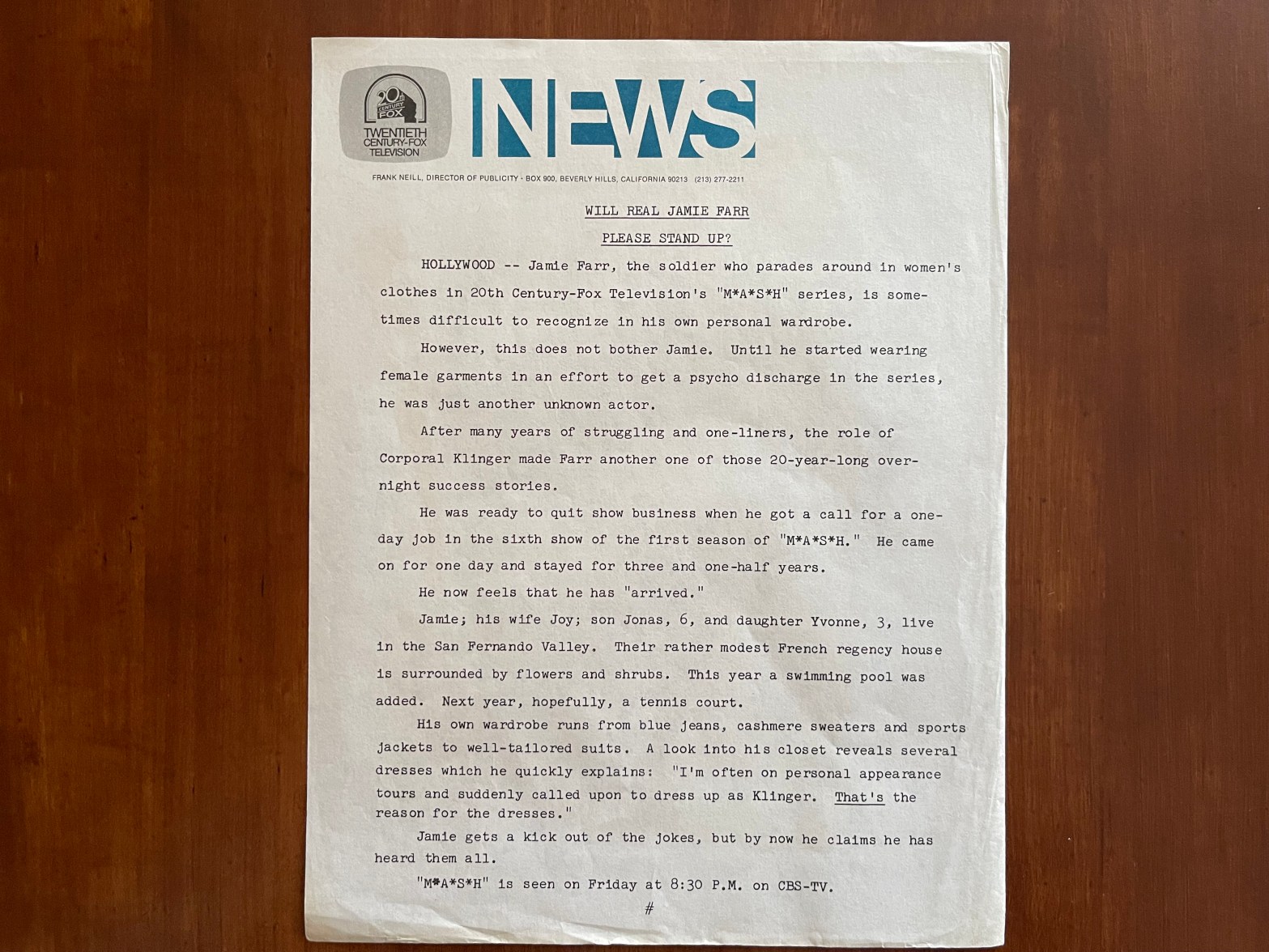 In the 1970s, fans of television relied on local news publications, national publications such as TV Guide, and talk shows to learn about their favorite actors. Networks and production studios would release information about upcoming seasons of a series and the next week’s episode. Occasionally they would release what are sometimes called “feel good” piecesContinue reading “Press Pass 11: “Will Real Jamie Farr Please Stand Up?””